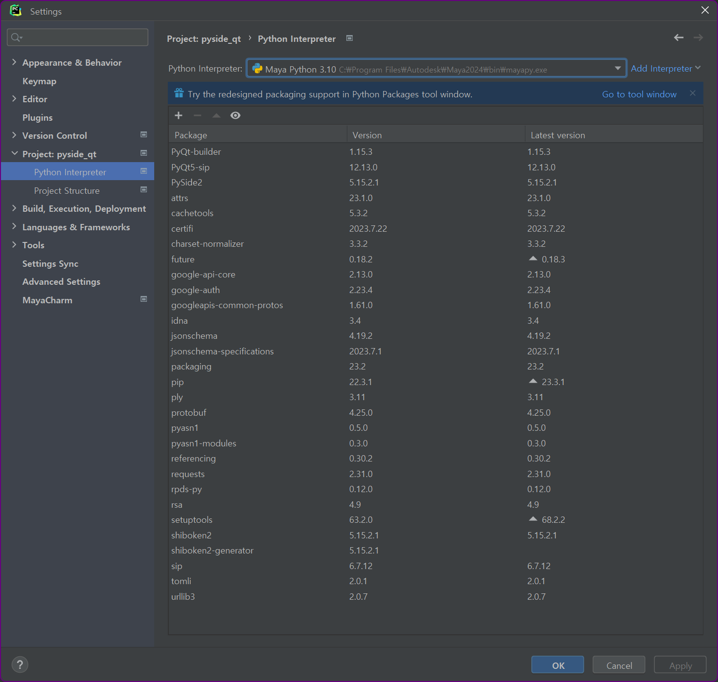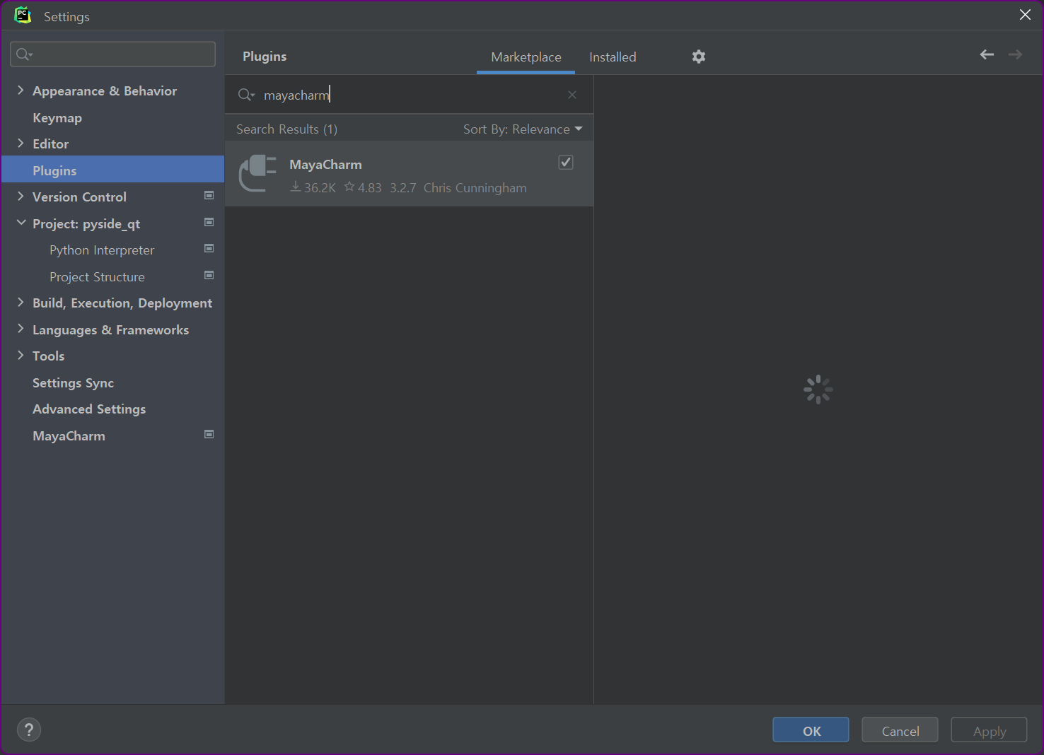 파이참을 실행 후 File/Setting 창을 열고 Plugins 에서 MayaCharm 을 검색 하고 인스톨 하자.