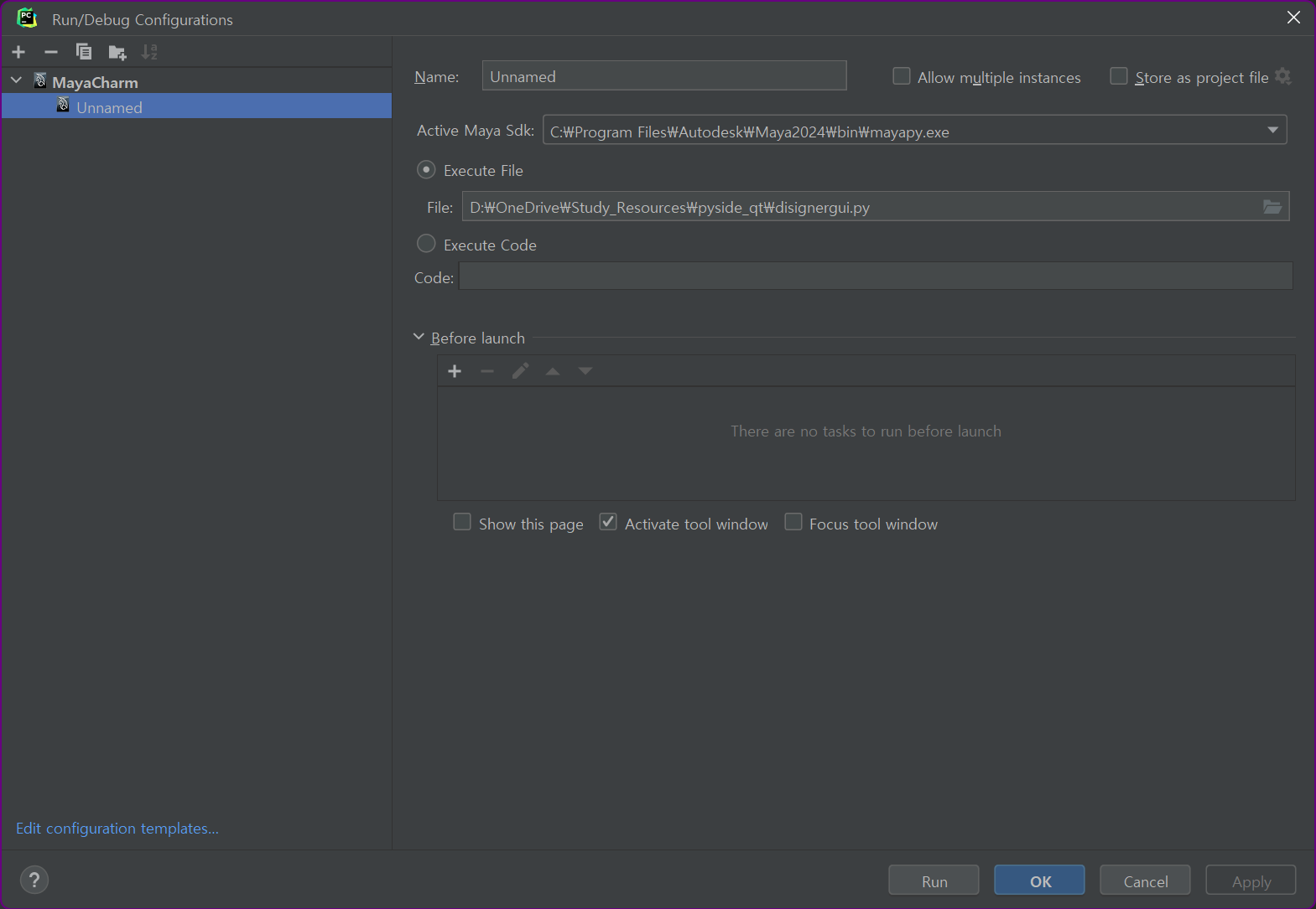 처음 등록 할 때 Active Maya Sdk: 여기가 비어 있을 겁니다. 그 아래 + 버튼 눌러서 Maya2024 설치 폴더의 bin/mayapy.exe 를 지정 해 주면 되며 포트는 4434 포트로 자동설정 될겁니다.