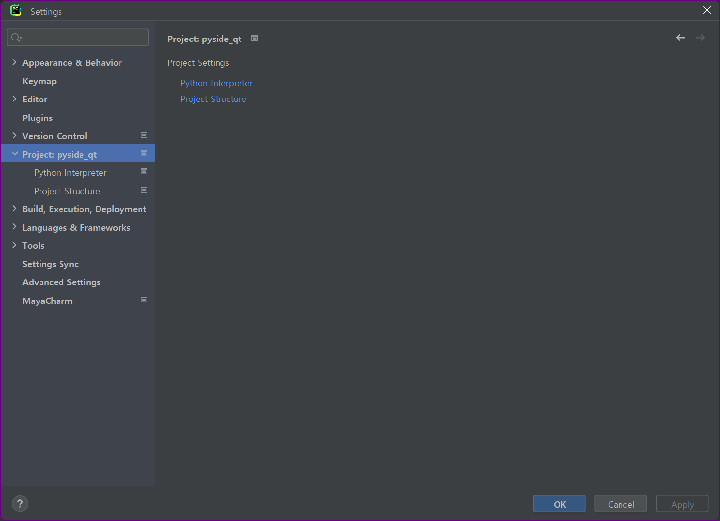 이 기사를 위해 잠시 프로젝트를 생성 했는데 프로젝트 명이 pyside_qt 일 뿐입니다. 아무튼... Pythond Interpreter 를 추가 합니다.