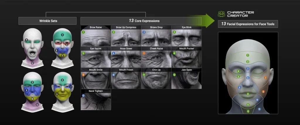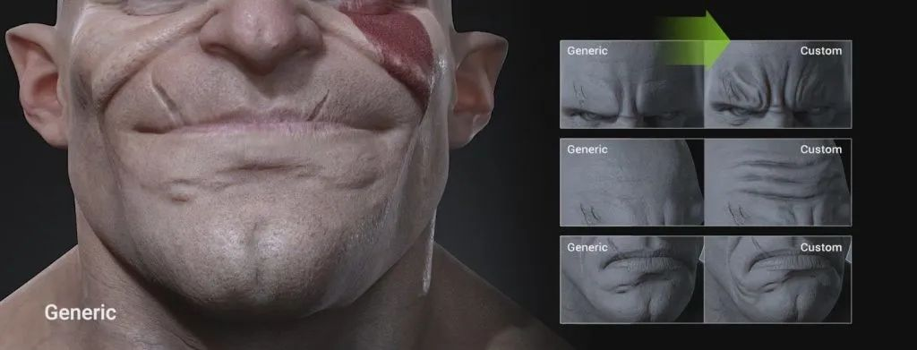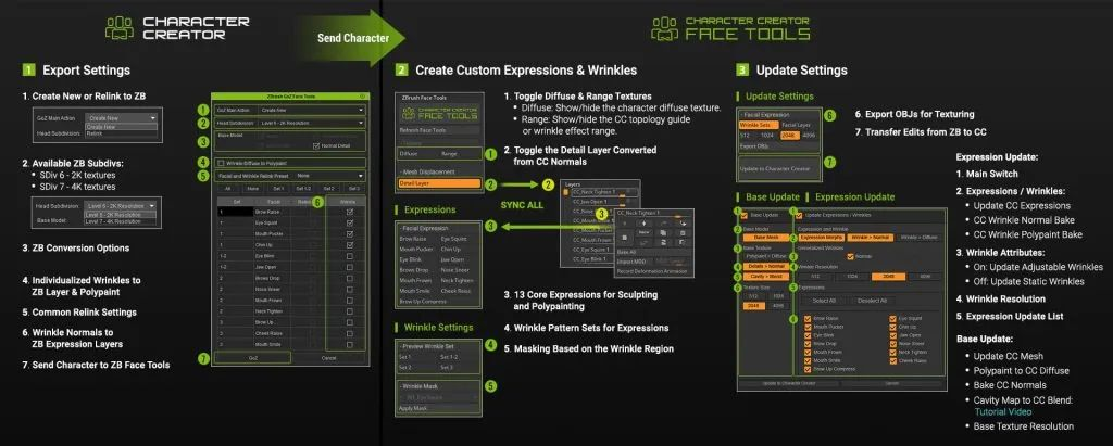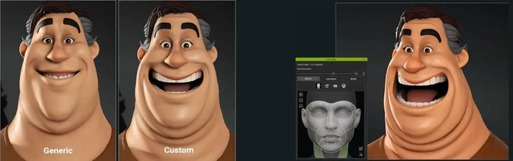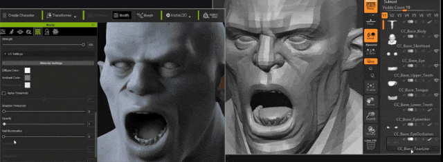 디자이너는 FACS 얼굴 스캔에서 최적의 캐리커처를 만들기 위해 ZBrush를 사용하여 고해상도 메시에서 CC 핵심 얼굴 표정에 이르기까지 복잡한 모델 디테일과 음영을 투영할 수 있습니다. 눈, 치아, 혀에 대한 추가 기능 모프 및 변형도 각 핵심 모프 모양에 맞게 지원됩니다.
