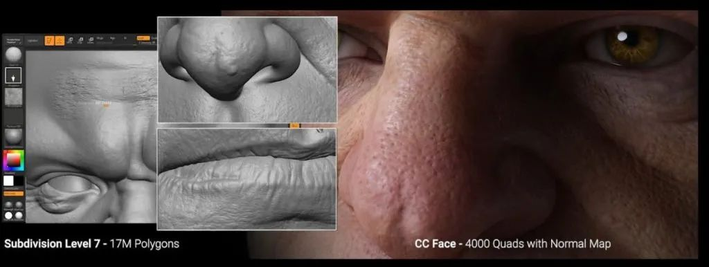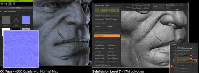 페이스 도구는 Character Creator 라인 드로잉을 디테일한 Z브러시 메시로 변환할 수 있다는 점에서 독특합니다. 이러한 세부 레이어는 미세한 피부 텍스처를 조각하는 데 기초가 됩니다.