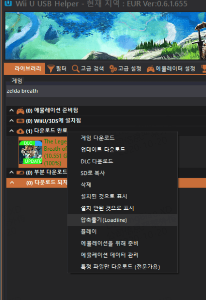 다운로드 완료에서 Zelda를 선택하고 마우스 오른쪽 단추를 누르면 압축 풀기 메뉴가 나타납니다.
