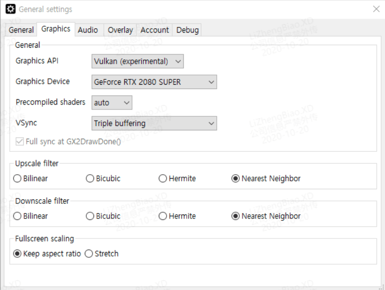 Graphics API를 Vulkan으로, VSync를 Triple buffering으로, Upscale filter를 Nearest Neighbor로 변경합니다.
