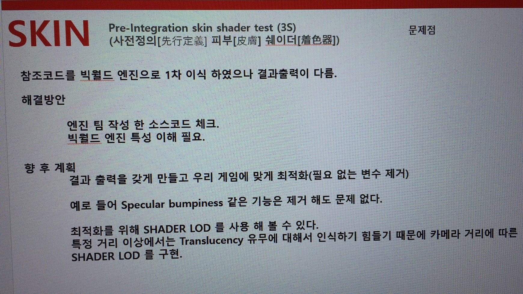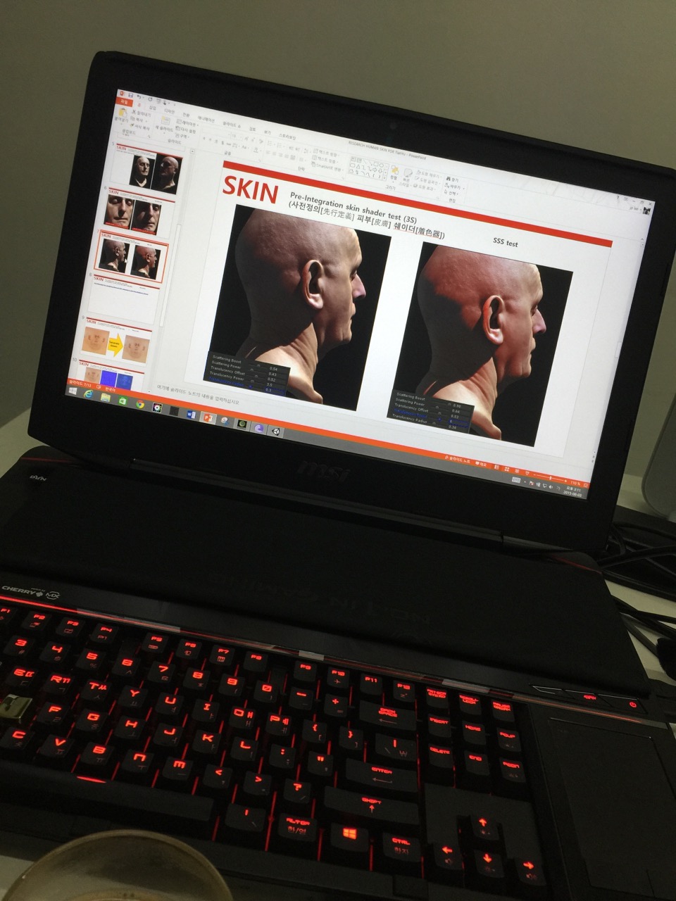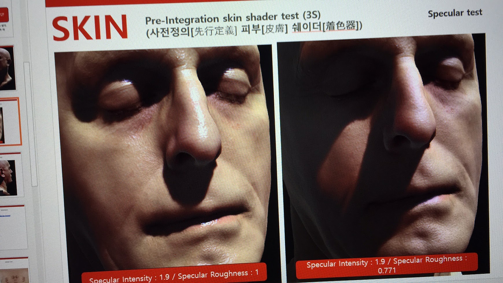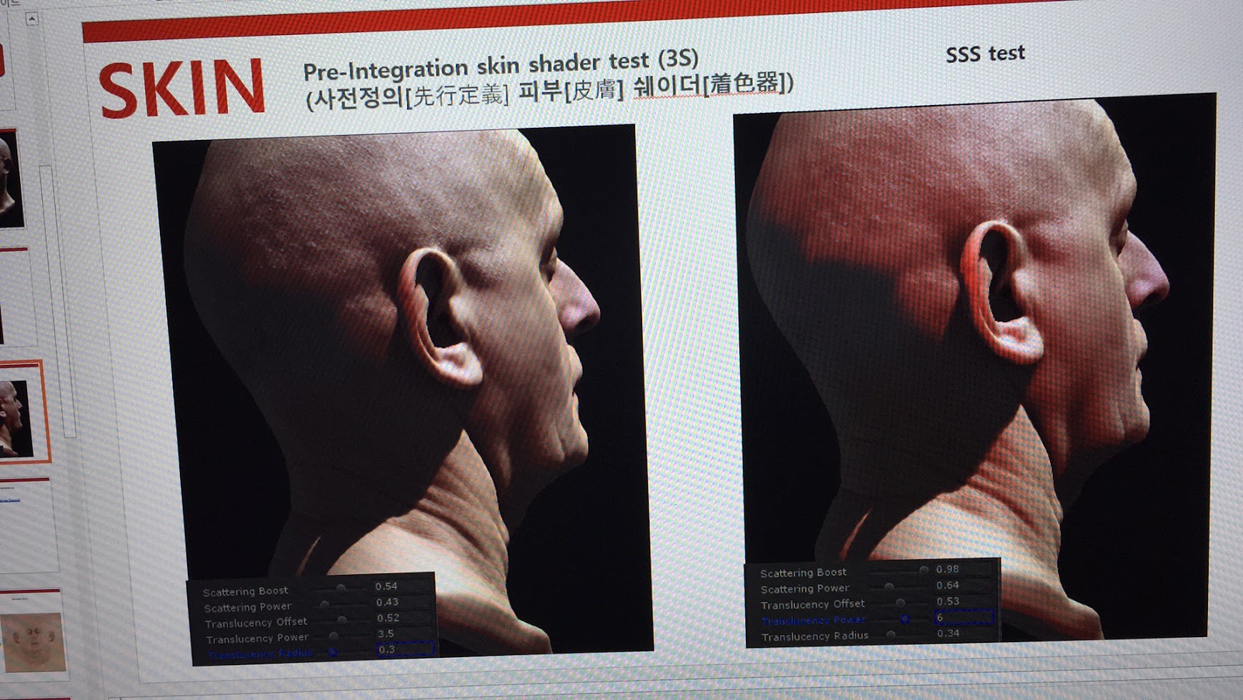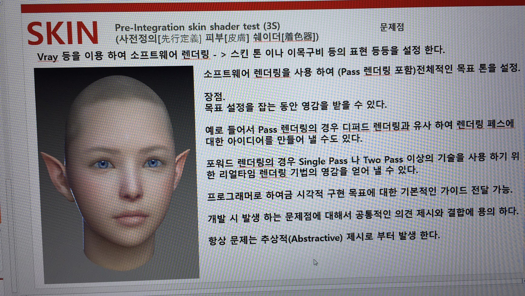 아무튼... 사전정의 디퓨전 프로파일 기반의 피부렌더링 기법에 대해서 발표를 준비 했었습니다. 당시에 그쪽에 관심이 많았었기 때문이고 음.... 뭔가 변화가 확 느껴지는 분야이기도 했고요... 그리고 그 당시 중국 아티스트들이나 프로듀서분들은 배경 보다는 캐릭터 렌더링에 중점을 두고 관심을 많이 갔던 성향이 있었습니다. 나중에 알게 된 사실인데... 게임 출시 할 때 캐릭터 중심의 마케팅이 무척 중요하고 임펙트가 있다고 그러더군요. 결국 뭐 마케팅 용도의 일환이었다는 것이죠.