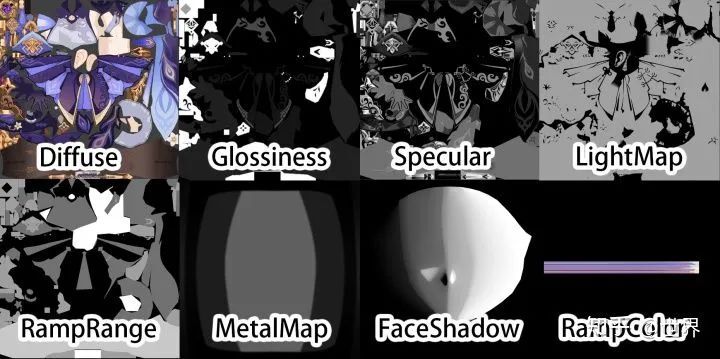 이 맵은 원신의 원본 머티리얼맵 매핑의 알파 채널에 있으며, 선형으로 변환한 다음 다음과 같이 머티리얼 램프 사이의 그레이 스케일 1.0~0.0에서 컬러(사실 스노우 페더에서도 언급됨)를 흡수해야만 구분할 수 있습니다.
