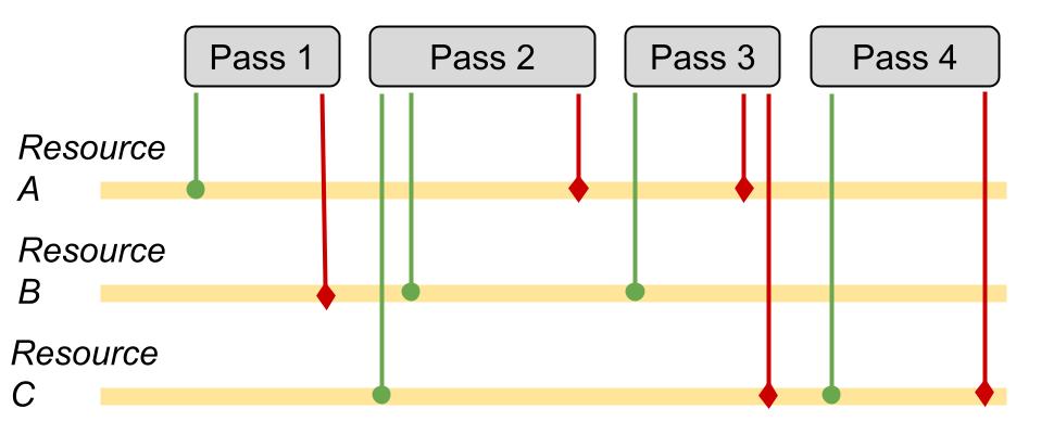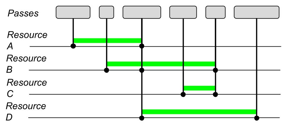 위 이미지는 리소스 사용의 시각적 예를 보여줍니다. 녹색 선은 읽기 작업이고 빨간색 선은 각 렌더링 패스에 대해 서로 다른 리소스에 대한 쓰기 작업입니다.