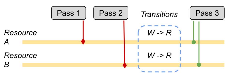 단일 명령 대기열에서 최적의 배리어 구성을 감지하는 것은 매우 간단합니다. 리소스 A가 패스 1에서는 셰이더 리소스로 사용되지만 패스 2에서는 렌더 타깃으로 사용되는 경우, 두 패스 사이에 타깃을 렌더링하기 위한 리소스 전환이 필요합니다. 패스 1과 패스 2 모두 리소스 A를 셰이더 리소스로 사용하는 경우 전환을 수행할 필요가 없습니다.