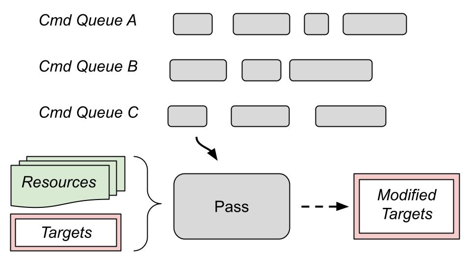 각 렌더 패스마다 프로그래머는 셰이더 입력, 렌더 타깃 및 뎁스 스텐실로 사용할 리소스를 선언합니다(자세한 내용은 컴포지션 및 워크플로 섹션에서 확인할 수 있습니다). 이는 각 패스에 필요한 리소스 전환을 추론할 수 있다는 점에서 큰 장점입니다.