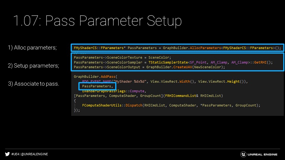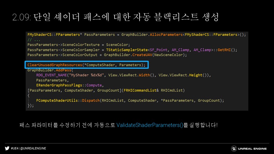위의 코드를 보면 왜 다른 '패스' 파라미터 구조체가 아닌 셰이더 파라미터 구조체를 사용하여 패스 파라미터를 표현하는지 의문을 가질 수 있습니다. 이는 셰이더와 1대1인 패스(엔진에서 가장 빈번하게 사용되는 패스 유형)를 쉽게 작성하기 위한 의도적인 디자인 결정이었습니다. 위의 셰이더 파라미터 구조체는 두 가지 용도로 사용됩니다. 패스 설정: 거의 모든 리소스가 셰이더를 통해 생성/소비되므로 셰이더 메타데이터 리소스가 패스에서 어떻게 사용될지(예: 읽기 대 쓰기) 알 수 있습니다. 이 정보는 리소스 전환에 매우 중요합니다. 파라미터 값을 명령 목록으로 설정하기: 패스 내의 셰이더는 패스 리소스를 '추출'할 필요 없이 전체 구조체를 바인딩하기만 하면 됩니다. RDG 리소스는 RHI 셰이더 파라미터 바인딩 코드에 의해 자동으로 역참조됩니다.