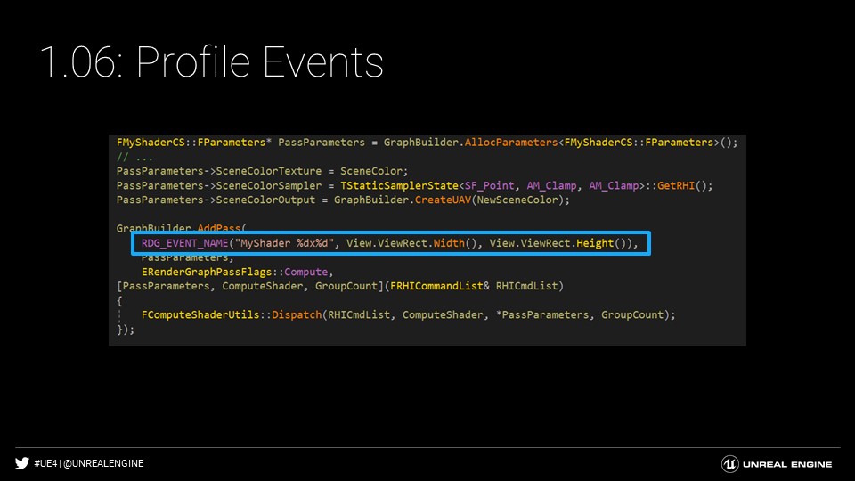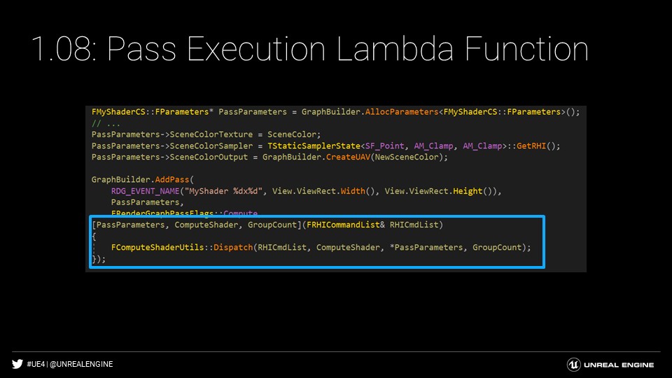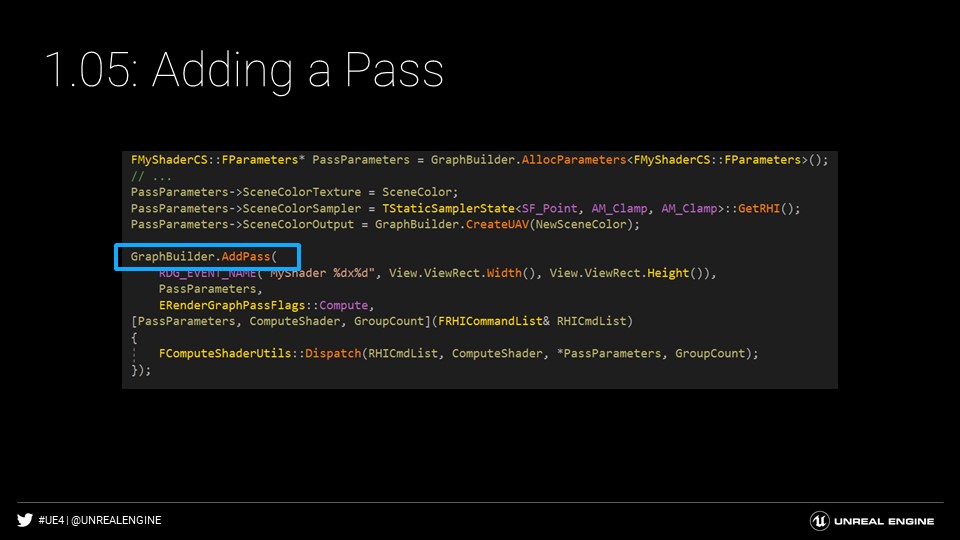 그래프에 패스를 추가하기 위해 빌더는 AddPass 함수를 제공합니다. 이 함수는 그래프 실행 중에 호출되는 람다를 받습니다. 람다는 RHI에 작업을 디스패치하기 위한 RHI 명령 목록을 제공합니다. 이 패스는 셰이더 파라미터 구조체를 받아들이고, 이 구조체의 모든 _RDG_ 파라미터를 반영합니다. 다른 모든 셰이더 파라미터는 무시됩니다.