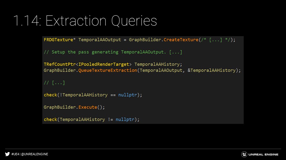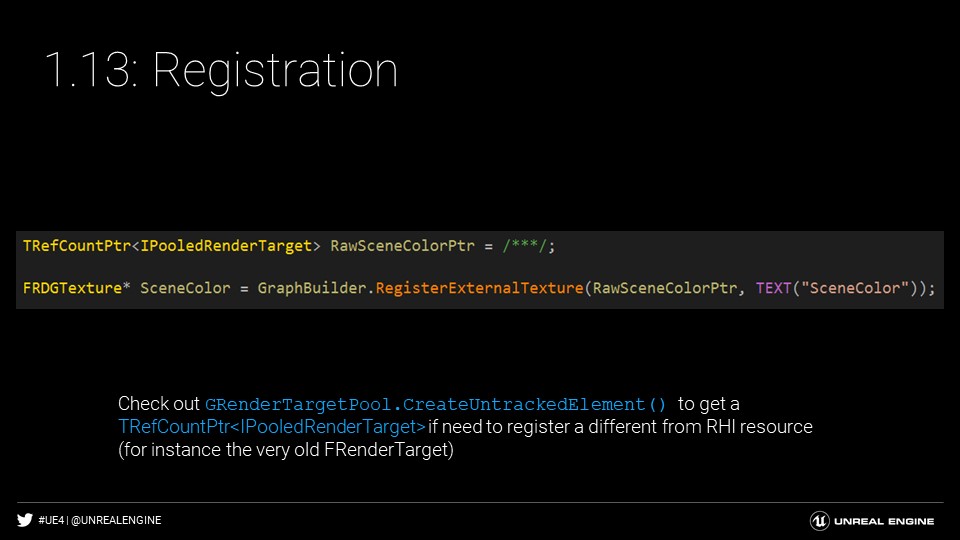 렌더 그래프는 현재 텍스처 할당을 제어하기 위해 IPooledRenderTarget 인터페이스를 활용합니다. 기존 리소스를 그래프로 가져와야 할 때가 있습니다(특히 RDG 변환 프로세스 중). 빌더는 기존 렌더 타깃에 의해 지원되는 RDG 텍스처 인스턴스를 반환하는 RegisterExternalTexture를 노출합니다.