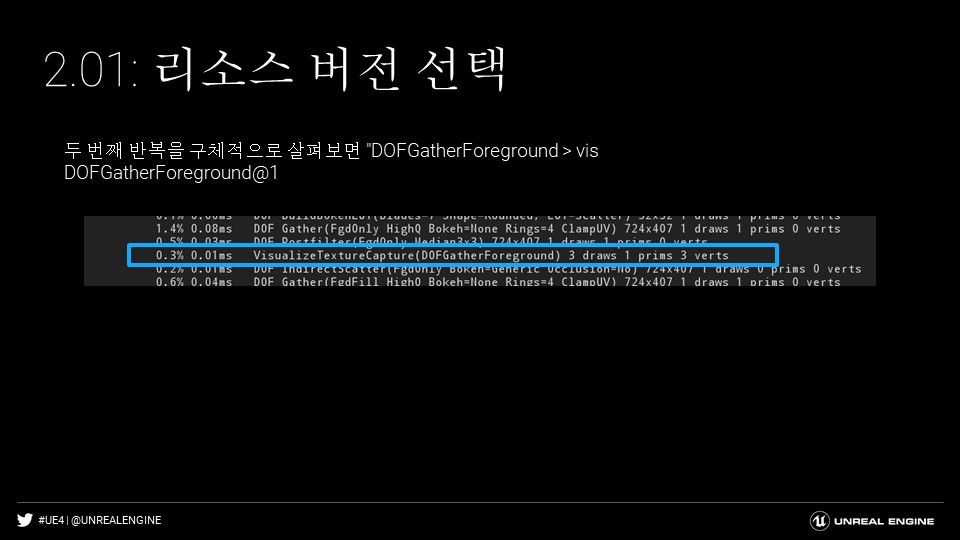 UE4 는 그리기 이벤트 외에도 버킷에서 GPU 타이밍 통계를 추적합니다. 이는 `stat gpu` 콘솔 명령으로 표시됩니다.
