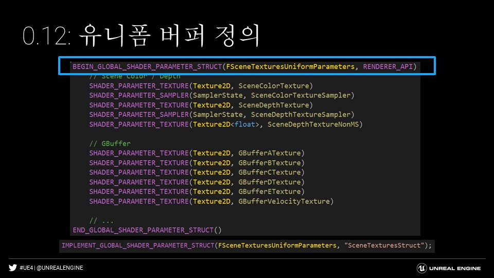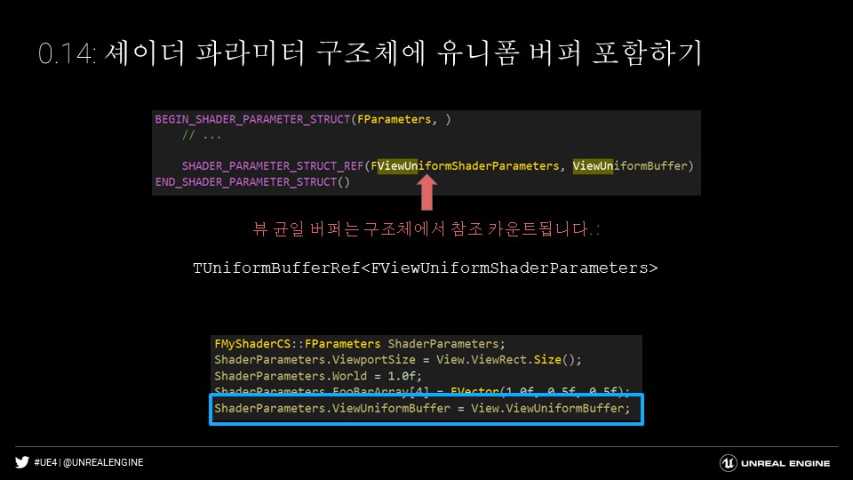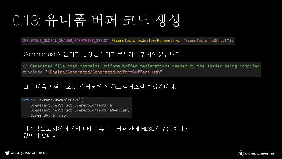 유니폼 버퍼는 동일한 셰이더 파라미터 구조체 모델을 활용하지만, 파라미터를 '전역'으로 선언하는 전용 매크로가 있습니다.