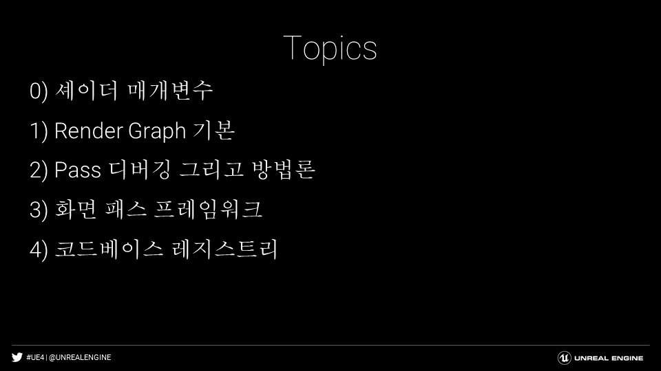 이 슬라이드 자료는 언리얼 엔진의 새로운 렌더링 종속성 그래프 시스템(이하 RDG) 사용법을 간략하게 설명합니다.