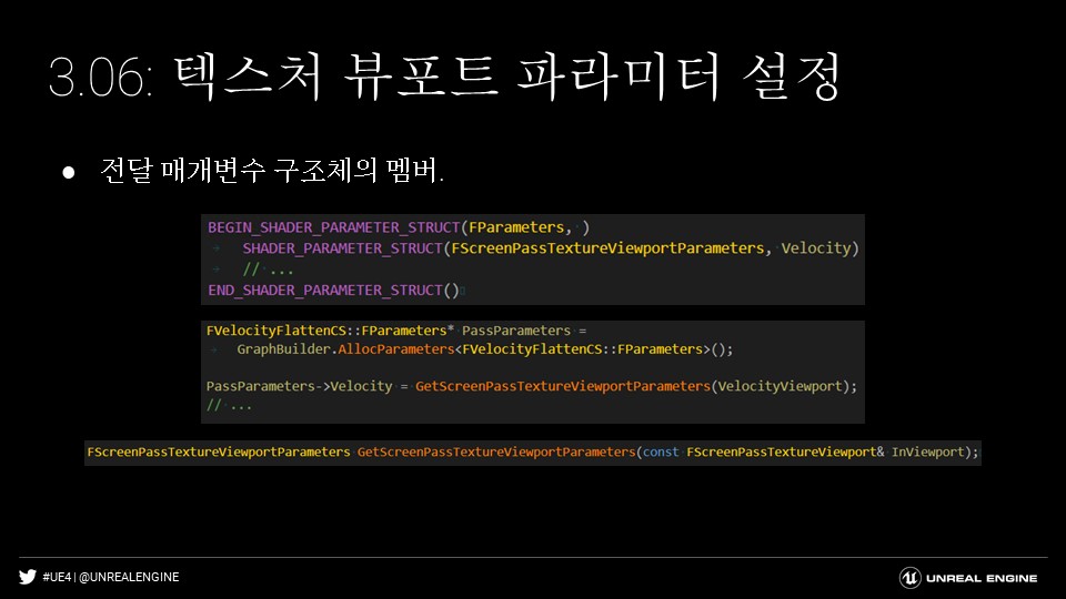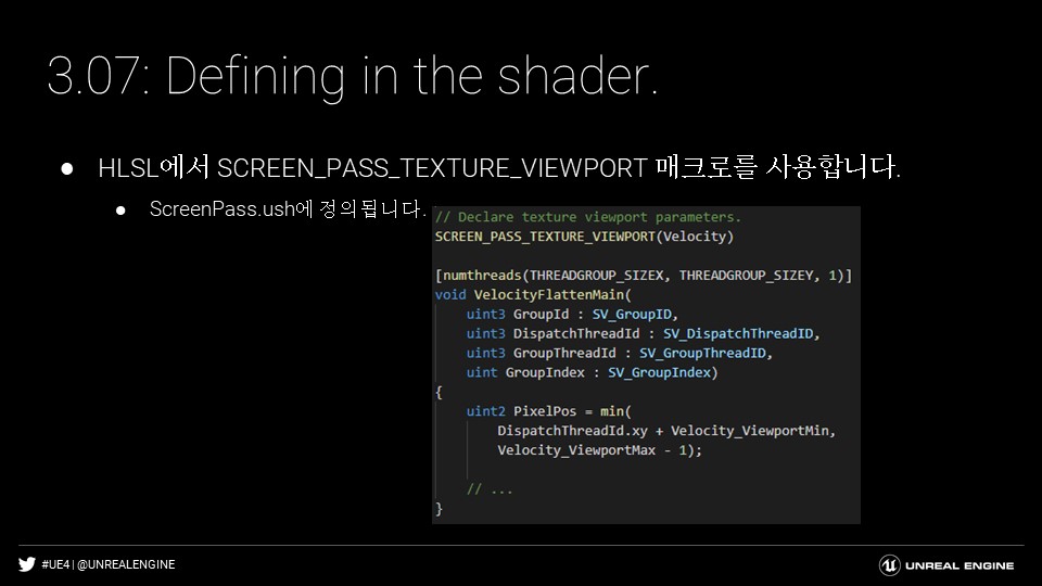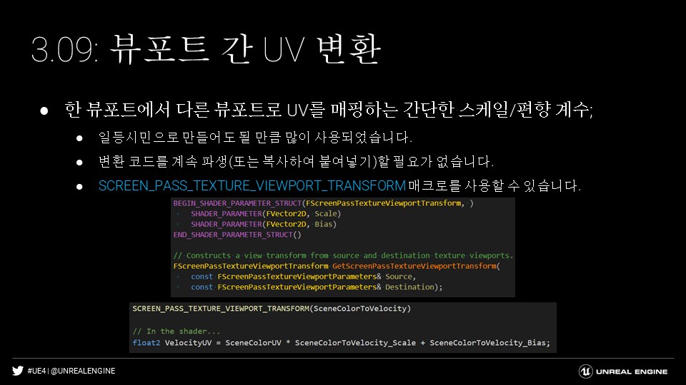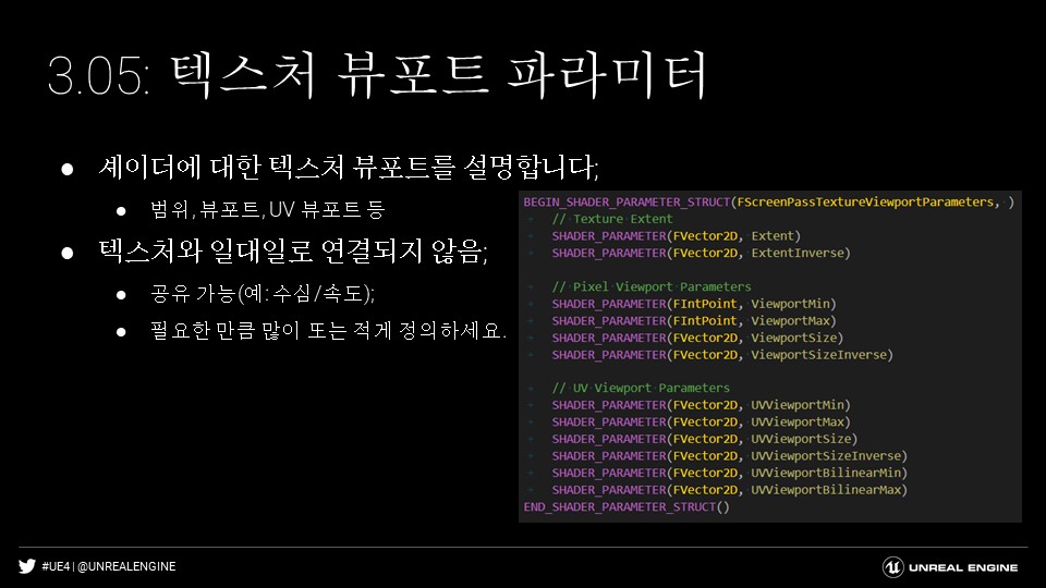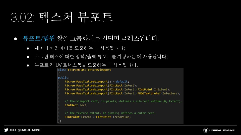 셰이더 측면에서 프레임워크는 HLSL에서 텍스처 뷰포트 파라미터를 정의하는 매크로를 제공합니다. 따라서 개별 멤버를 일일이 추가할 필요가 없습니다. 이 매크로는 ScreenPass.ush에 정의되어 있습니다.