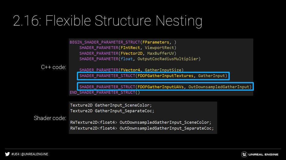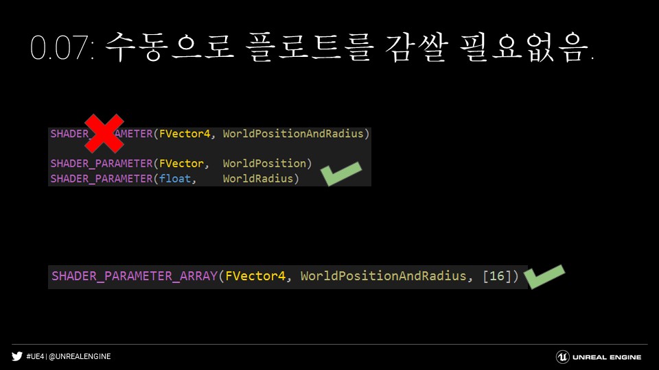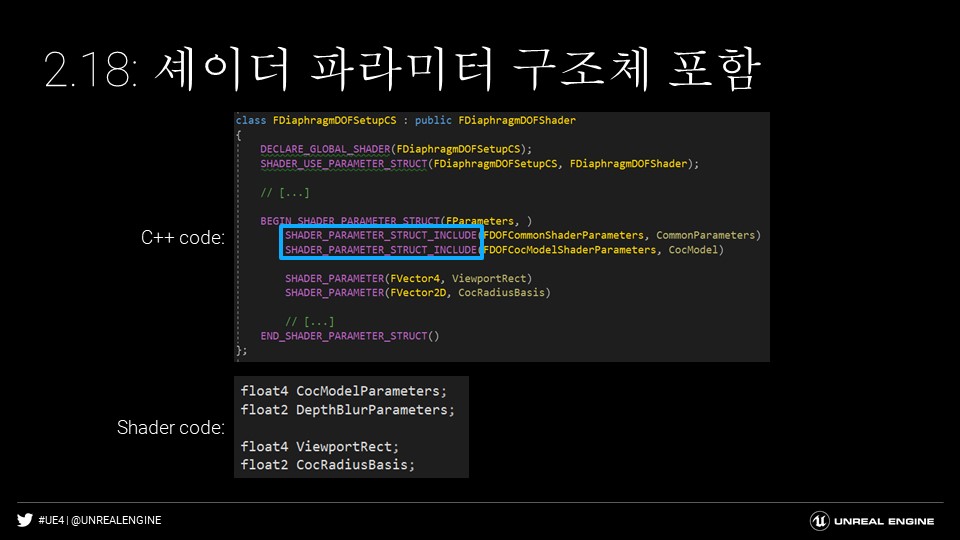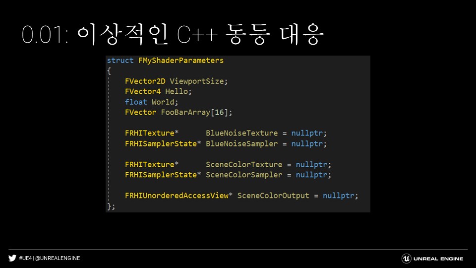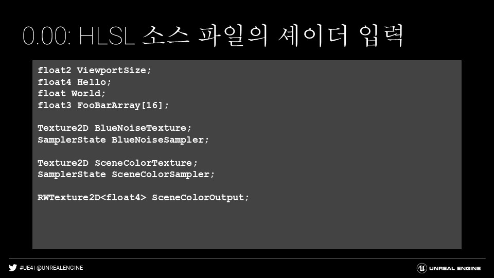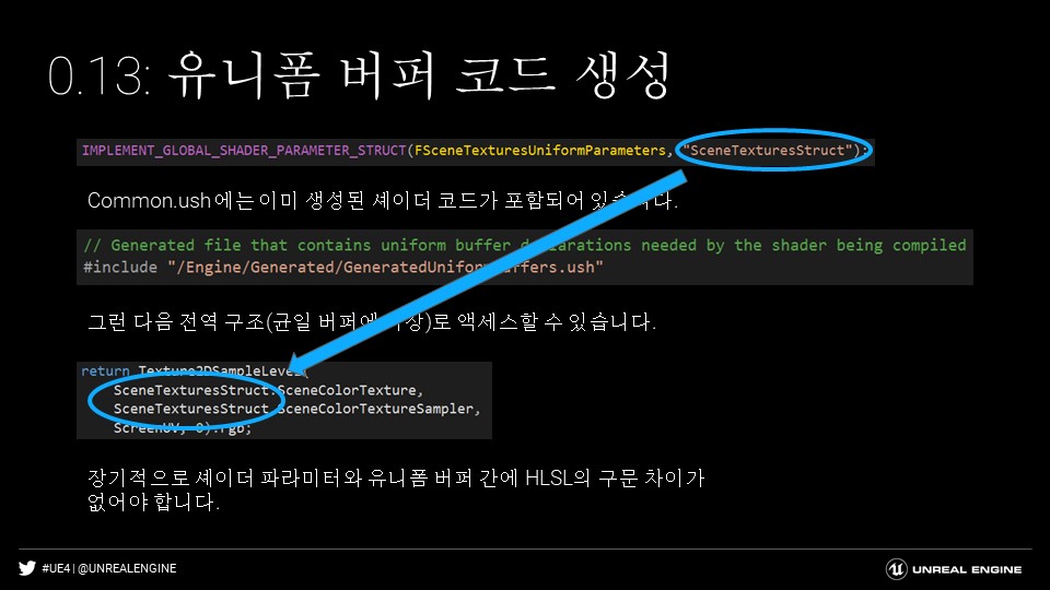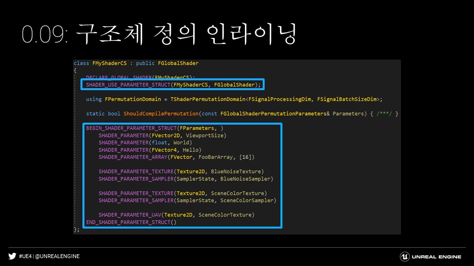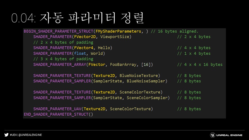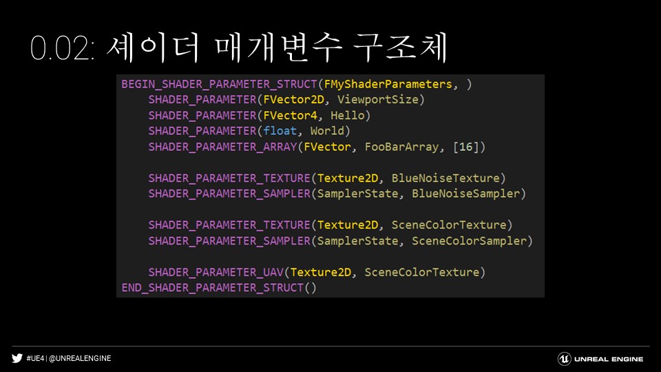 글로벌 셰이더 파라미터 구조는 셰이더 코드에 자동으로 반영되는 추가 기능(및 오버헤드)과 함께 일부 HLSL 구문 특수성을 처리하는 기능이 있습니다.