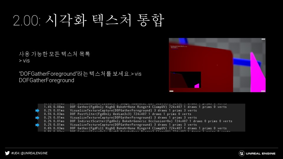 RDG는 텍스처 시각화 툴에 FRDGTexture를 자동으로 노출합니다. 모든 쓰기 작업이 기록됩니다. 콘솔에서 CreateTexture()에 지정한 디버그 이름을 직접 입력하기만 하면 표시됩니다.