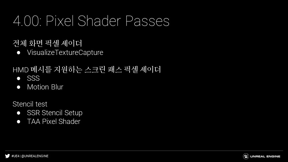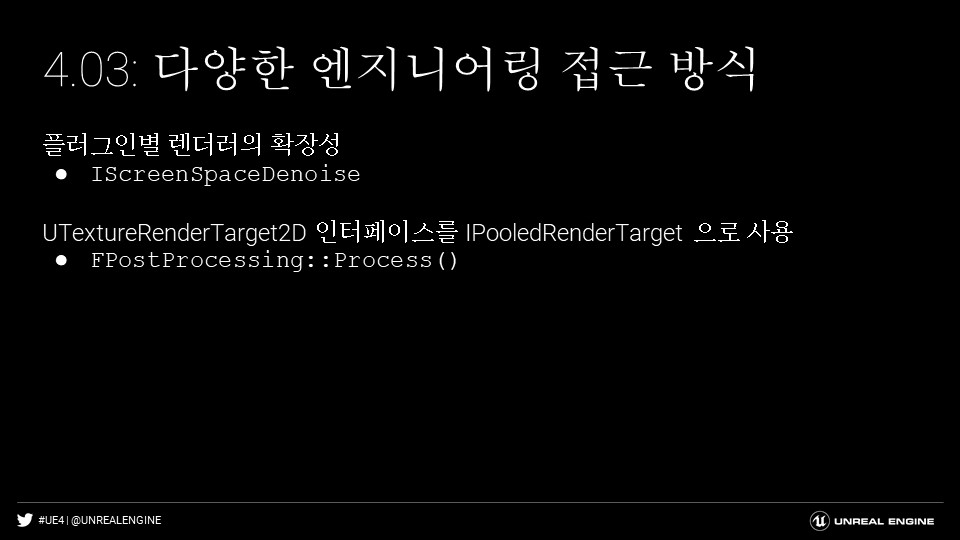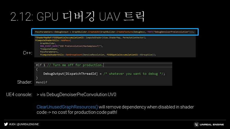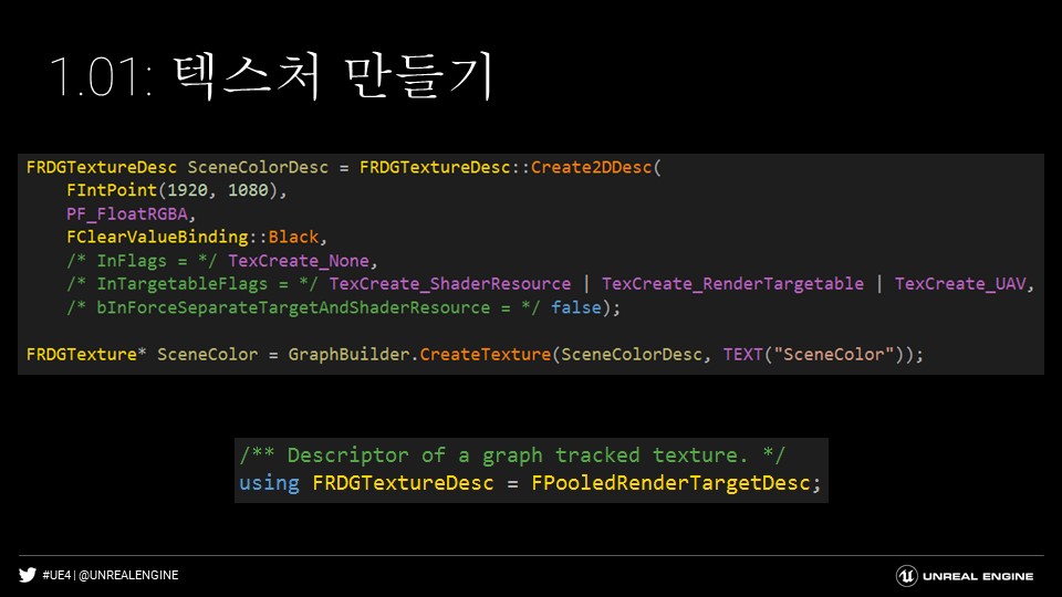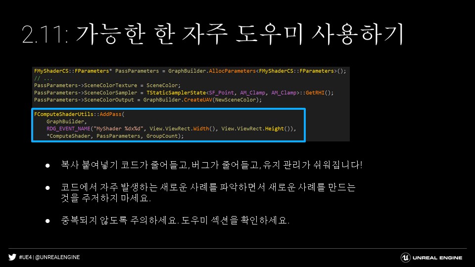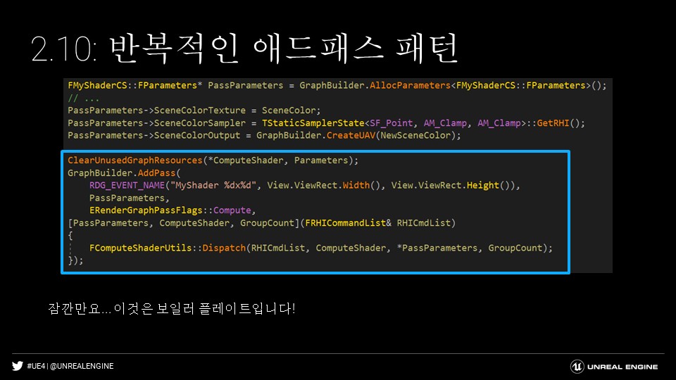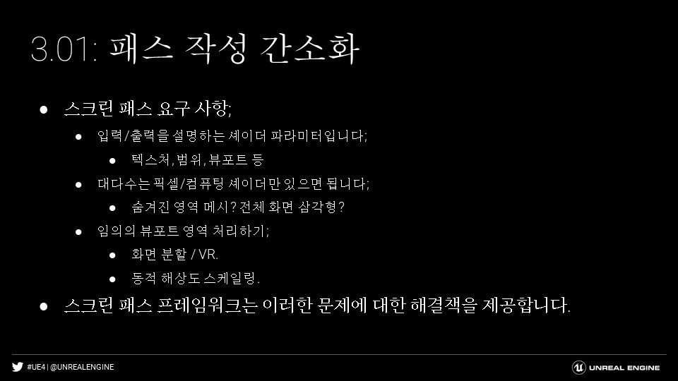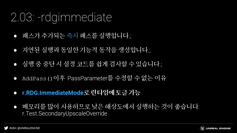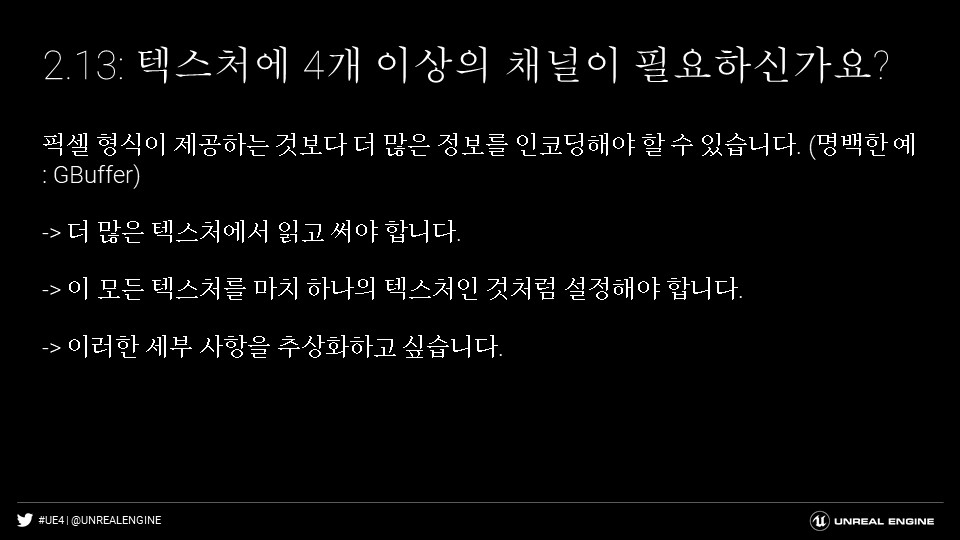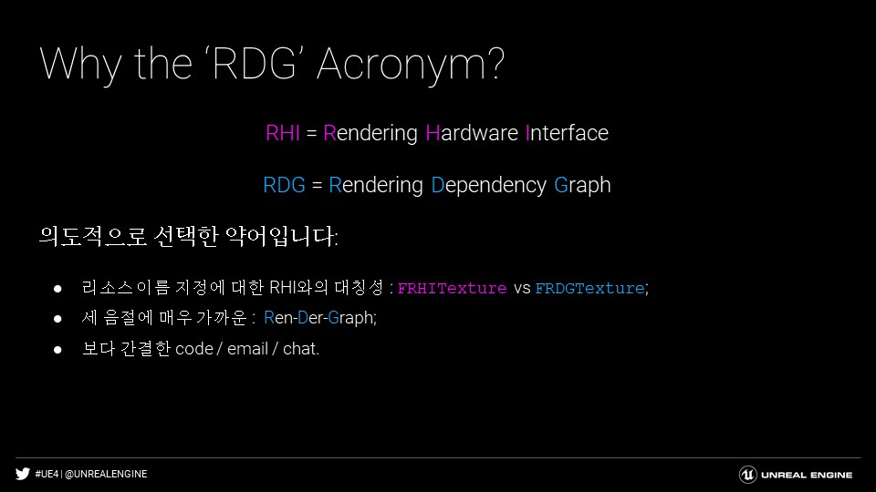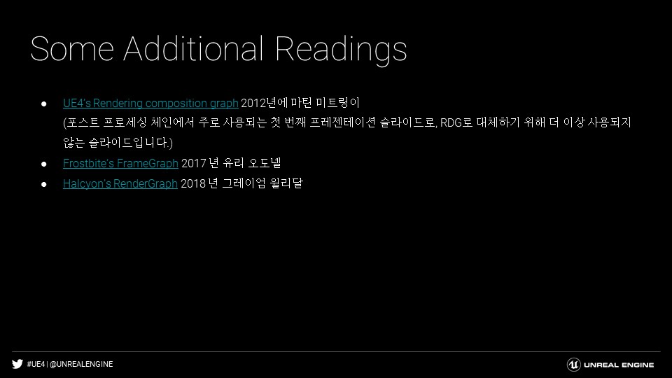 요 몇일동안은 아트팀을 직접 지원하는 셰이더 함수작업을 했습니다. 엔진 소스를 수정해야 할 필요가 없는 수요 부터 우선순위를 올려서 작업중이죠. 최대한 엔진 소스를 고치지 않는 선에서 시각적으로 인가 할 수 있는 수준으로 구현하는 것이 가장 올바른 선택이지않나 생각합니다. 특히 이런 사용엔진을 쓰는 경우에는 말이죠. ( 우린 소니 산타모니카 스튜디오가 아니니까요... 하하 ) 하지만 특정 아바타 클래스들을 위한 심층적인 수요를 만족하기 위해서는 소스코드에 접근해야 하는 경우가 분명히 필요 합니다. 또는 그 외에 더 깊은 효과를 구현하기 위해서도 그렇고 최적화를 달성하면서도 그렇고 말이죠... 분명히 RDG를 잘 이해하고 사용해도 사용하는 것이 바람직해 보입니다. 그래서 아무튼... 또 내일 출근 하면서 1시간 정도 소요되는 지하철 출근시간을 알차게 보내기 위해서 이렇게 RDG 101 애픽게임즈가 몇년 전 발표했던 PPT 를 주석번역 추가하여 올려봅니다.