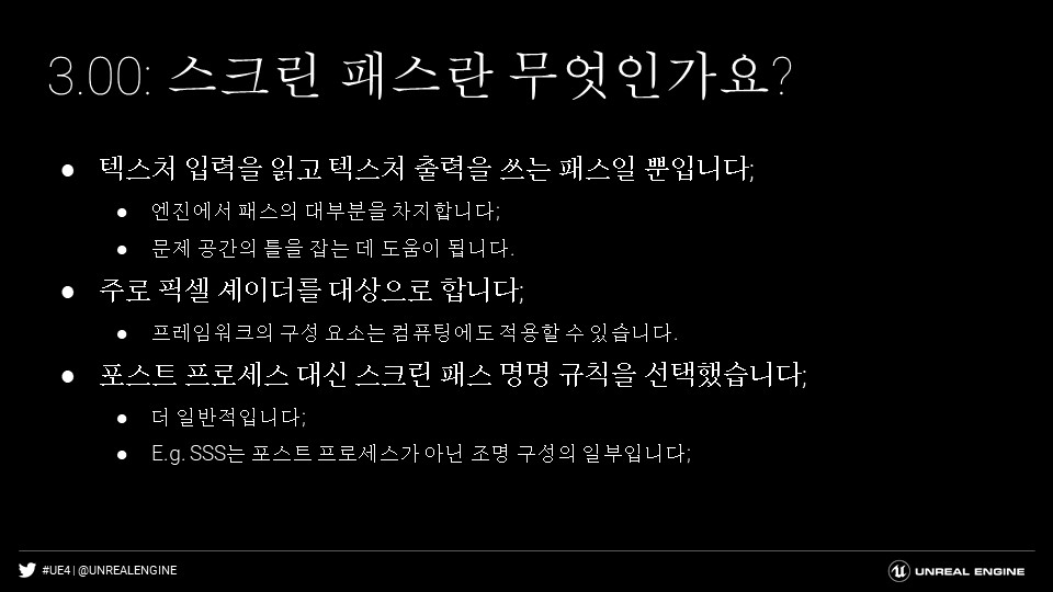 먼저 스크린 패스란 무엇인가요? 기본적으로 텍스처 입력을 읽고 텍스처 출력을 쓰는 패스라고 할 수 있습니다. 이 정의는 엔진의 대부분의 패스에 적용되며 문제 공간의 틀을 잡는 데 도움이 됩니다. 이 프레임워크는 주로 픽셀 셰이더 패스를 대상으로 하지만, 특정 컴포넌트는 계산 패스에도 적용할 수 있습니다. 네이밍에 대한 참고 사항: "포스트 프로세스" 대신 "스크린 패스" 규칙을 선택했습니다. 이것이 더 일반적이라고 생각했습니다. 예를 들어 서브서피스 스캐터링은 라이팅 컴포지션 단계에서 실행되므로 엄밀히 말해 포스트 프로세스가 아닙니다.