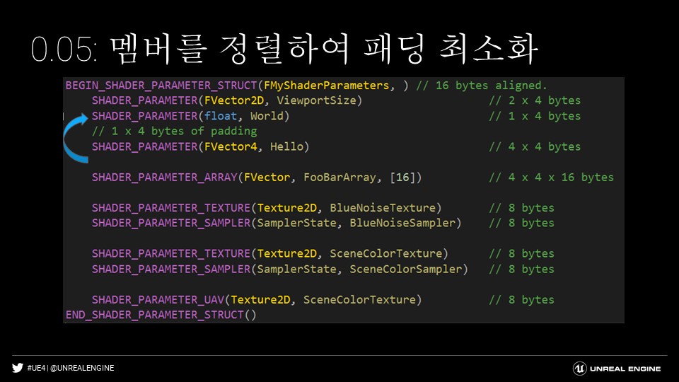 Padding을 최소화하거나 제거하기 위해 구조체를 구성하는 것도 고려해 보세요. 파라미터의 순서는 셰이더 소스에 어떤 식으로든 영향을 미치지 않으므로 GPU에 업로드되는 바이트 수를 줄일 수 있는 위험 부담이 적은 변경입니다. 위의 예제에서 'float World'를 위로 이동하면 FVector2D ViewportSize( a three float 구조체)에 필요한 4바이트 Padding 영역에 위치할 수 있습니다. 다시 말하지만, 이 three float 벡터는 16바이트(또는 4개의 플로트)로 정렬되므로 싱글 플로트 멤버를 네 번째 플로트 슬롯으로 이동하면 padding이 제거됩니다.