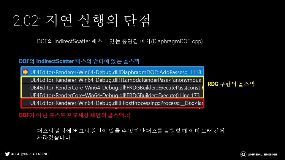 지연 실행의 가장 큰 단점은 디버깅을 어렵게 만든다는 것입니다. 패스 실행 중에 문제가 발생하면 문제의 원인이 설정 단계에 있을 수 있습니다. 하지만 설정 스택 프레임은 이미 오래 전에 사라졌기 때문에 모든 중간 설정 정보를 잃게 됩니다. 설정 코드에 중단점을 설정할 수도 있지만, 문제가 허위로 발생하거나 패스가 일반적인 실행 경로(예: 다운샘플 작업)일 수 있습니다.