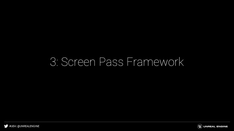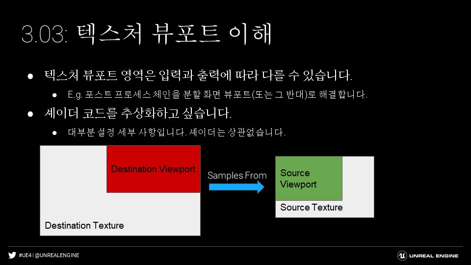 스크린 패스 프레임워크는 텍스처 뷰포트를 명시적으로 정의합니다. 이 데이터 구조는 픽셀 단위로 지정된 텍스처 범위 내에서 방향이 지정된 직사각형을 나타냅니다. 뷰포트를 UV 좌표로 표현하고 뷰포트 간에 매핑하기 위해서는 이 두 가지가 모두 필요합니다. 다음 슬라이드에서 살펴보겠지만 프레임워크에서 셰이더 파라미터를 도출하고, 스크린 패스를 위한 입력 및 출력 뷰포트를 정의하고, 뷰포트 간 UV 트랜스폼을 도출하는 데 사용됩니다.