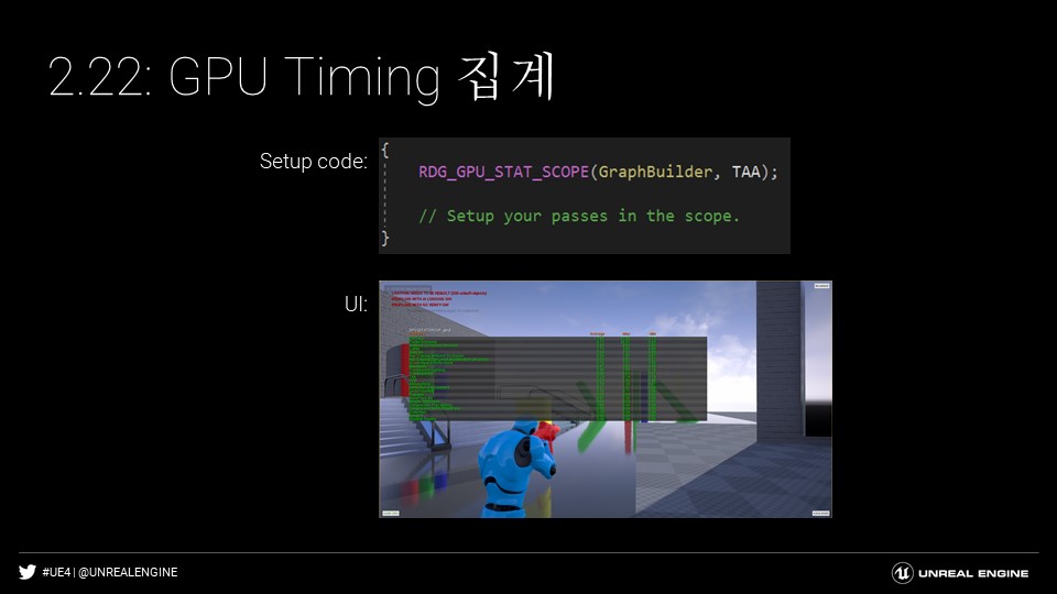 GPU 통계 지원은 스코프 형태로만 RDG 에 통합되어 있습니다. 패스 GPU 타이밍은 패스 구성 시 가장 안쪽 스코프로 집계됩니다.
