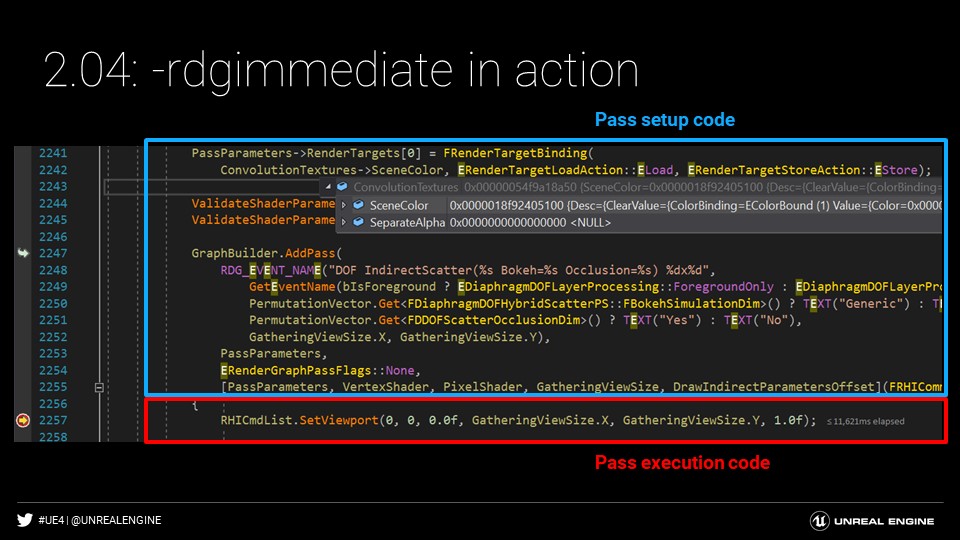 이 문제를 해결하기 위해 RDG는 즉시 모드로 실행할 수 있습니다. 이 모드는 추가 패스 중에 패스를 즉시 실행합니다. 이 모드는 전체 설정 프로세스 동안 모든 할당에 대한 참조를 유지해야 하므로 많은 메모리를 사용합니다(리소스가 사용될지 여부는 알 수 없습니다!). 하지만 실행 중에 중단점을 설정하고 문제가 발생한 부분을 명확하게 콜 스택으로 확인할 수 있다는 점에서 디버깅의 이점이 매우 큽니다. 이 모드는 시작 시 또는 런타임에 활성화할 수 있습니다.