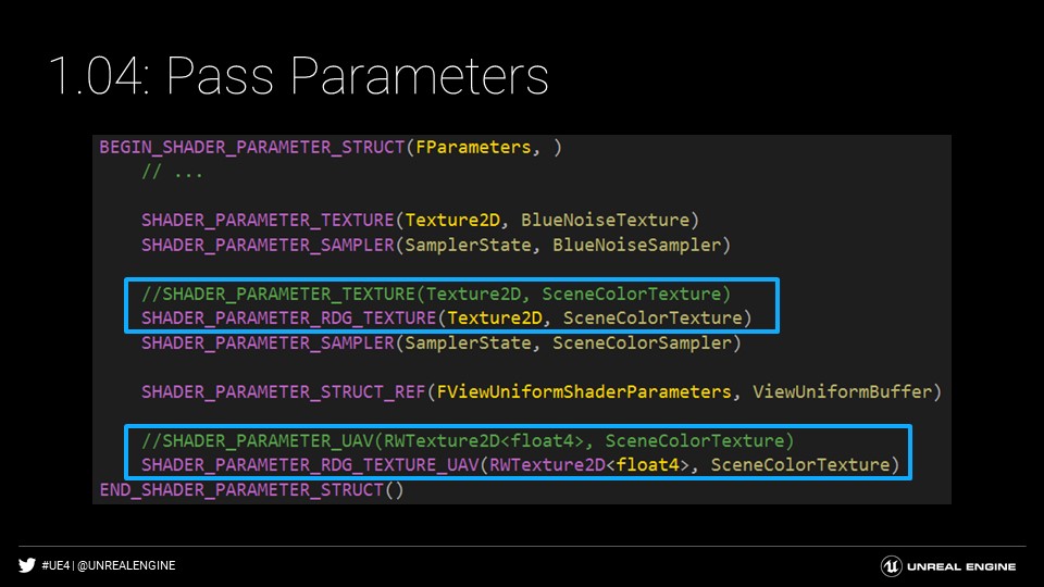 RDG 리소스를 패스와 연결(즉, 생성 또는 소비)하기 위해 _RDG_ 셰이더 파라미터로 선언된 수정된 SHADER_PARAMETER_STRUCT를 사용합니다. 이 셰이더 파라미터의 변형은 C++ RDG 리소스 포인터를 받아들입니다. 그래프는 패스에서 이 구조체를 탐색하고 패스의 관련 용도에 맞는 RDG 리소스를 등록합니다. 그래프가 패스에서 리소스가 어떻게 사용되는지에 따라 리소스의 수명을 추론할 수 있기 때문에 메모리 관리의 이점이 발휘되는 곳입니다.