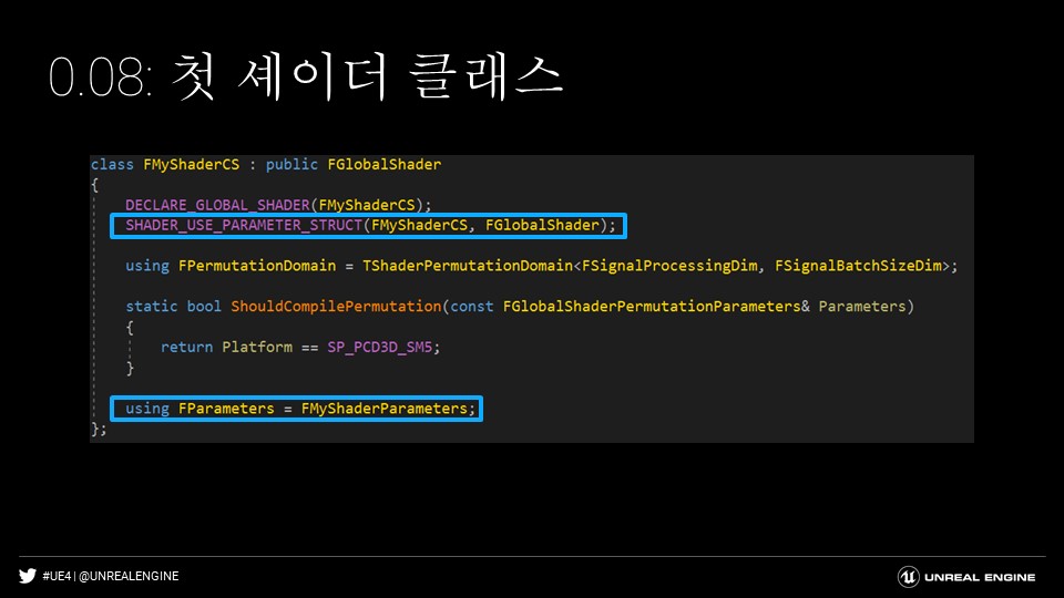 먼저 셰이더 클래스에 SHADER_USE_PARAMETER_STRUCT() 매크로를 추가합니다.