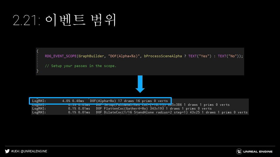 GPU 디버깅 툴에서 타이밍을 더 잘 구성하기 위해 코드에 이벤트 범위를 추가하여 그 안에서 생성된 모든 패스를 포함할 수 있습니다.
