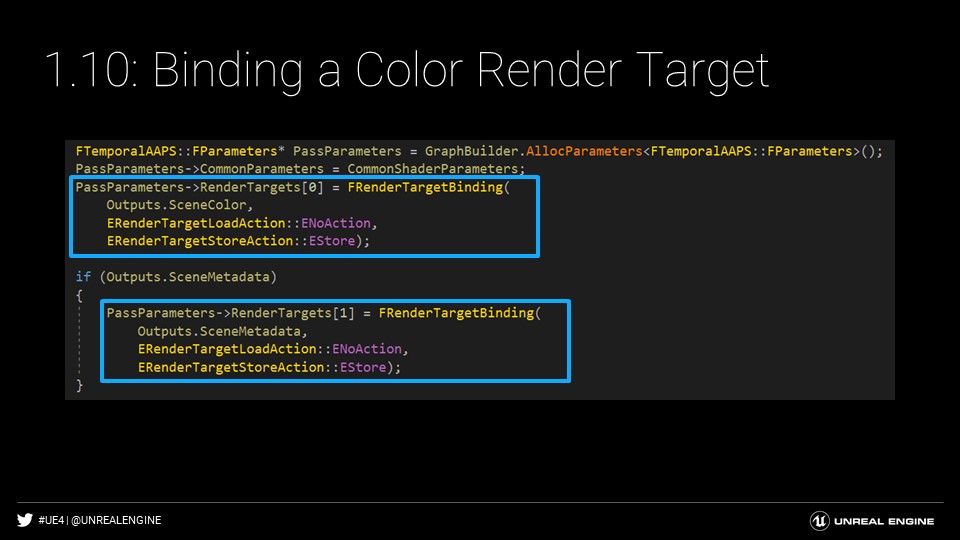 렌더 타깃은 바인딩 배열로 노출됩니다. 각 바인딩은 로드/저장 작업과 함께 RDG 텍스처를 받아들입니다.