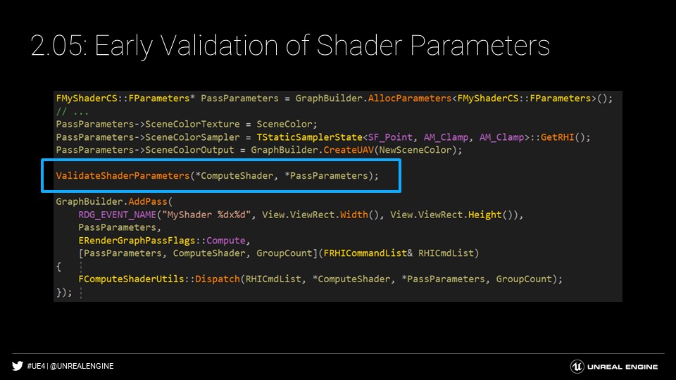 흔히 저지르는 실수는 필수 셰이더 파라미터를 비워 두는 것입니다. 앞서 언급했듯이 SetShaderParameters 함수는 필요한 셰이더 파라미터가 모두 있는지 확인합니다. 하지만 이 대신 설정 시 이러한 문제를 잡아내는 것이 좋습니다. 따라서 패스에 추가하기 전에 모든 파라미터가 있는지 확인할 수 있도록 ValidateShaderParameters가 제공됩니다.