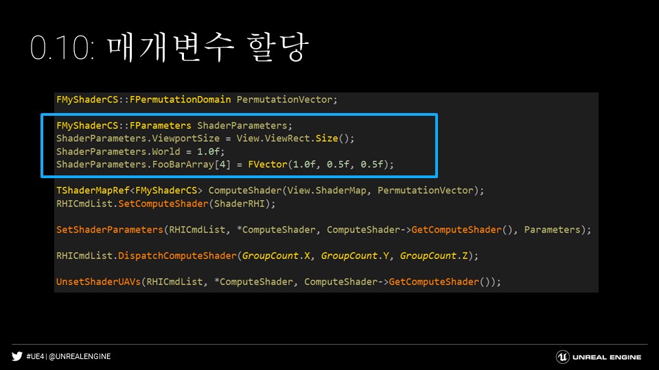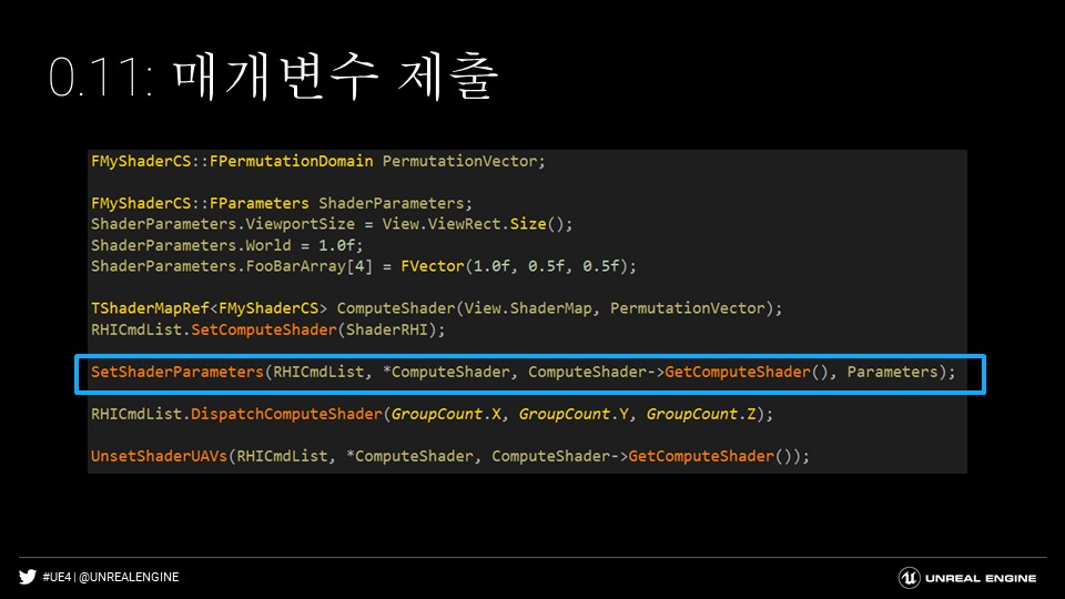 셰이더 파라미터 시스템은 파라미터를 RHI 명령 목록으로 푸시하는 헬퍼 함수인 SetShaderParameters를 제공합니다.