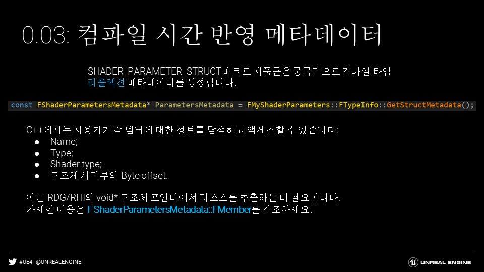 셰이더 파라미터 매크로 시스템의 특징은 컴파일 타임 리플렉션 메타데이터를 자동으로 생성한다는 점입니다. 모든 사용자는 런타임에 셰이더 파라미터 구조체의 내용을 통과하여 멤버별 정보에 액세스할 수 있습니다. 메타데이터는 공통 코드(예: RHI/RDG)에서 구조체의 보이드* 포인터 표현을 순회하고 리소스를 추출하는 데 필요합니다.