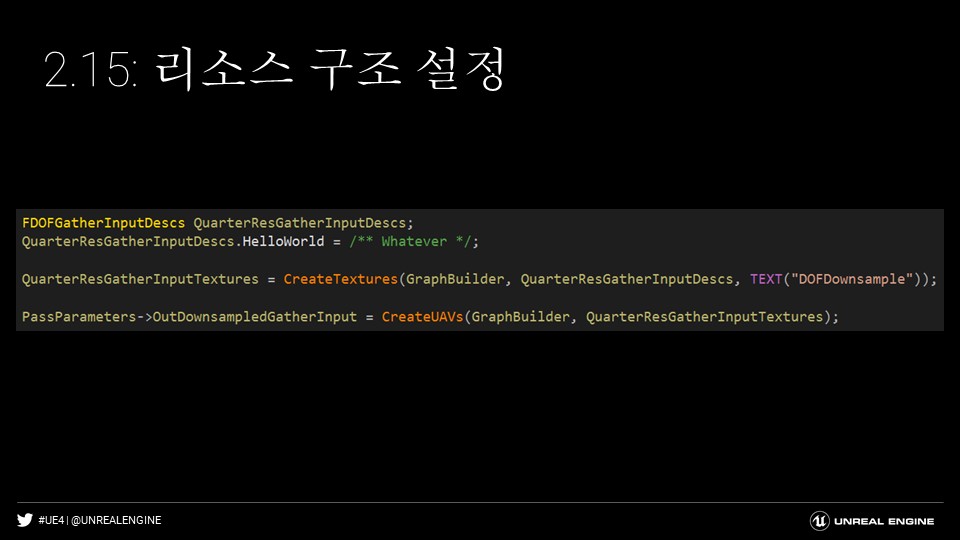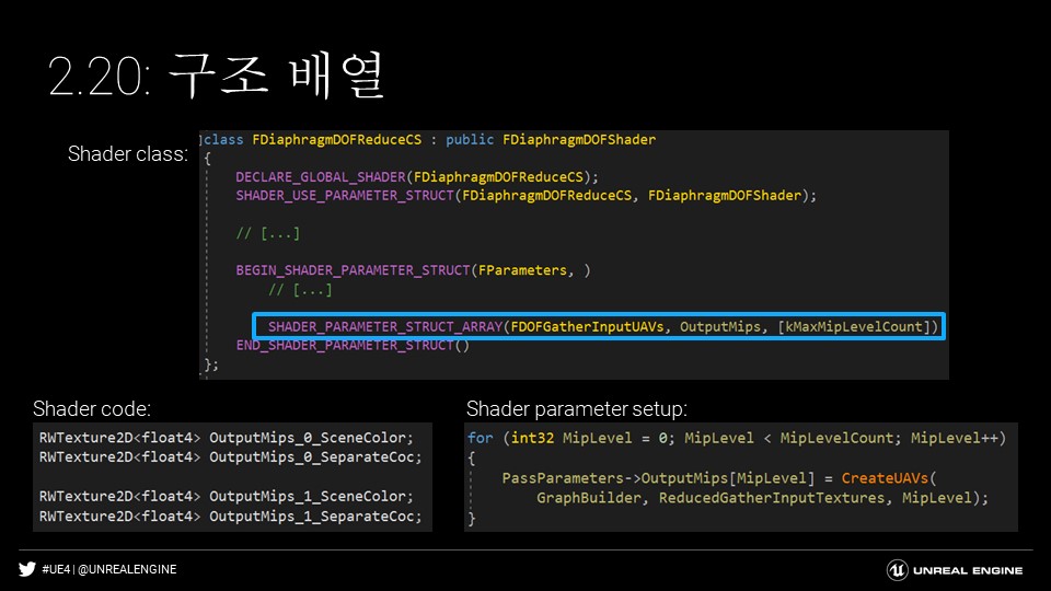 앞서 리소스를 FDOFGatherInputTextures를 사용하여 구조체로 구성하는 것이 얼마나 편리한지 소개했습니다. 뎁스 오브 필드 셰이더 중 하나가 이 리소스 구조의 각 텍스처에 대해 밉 체인을 생성해야 한다는 것이 밝혀졌습니다. 이 시스템은 이 사용 사례를 지원하기 위해 C++ 측에서 셰이더 파라미터 구조의 배열을 지원합니다. C++에서는 직관적인 for 루프를 사용하여 레이어당 모든 UAV를 설정하는 것이 훨씬 더 편리해집니다. 셰이더 코드는 구조 중첩과 같은 이유로 그다지 훌륭하지는 않지만, 적어도 C++에서는 이러한 제약이 없습니다.