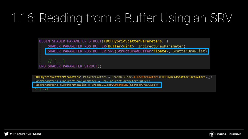 버퍼는 셰이더에서 SHADER_PARAMETER_RDG_BUFFER_SRV()를 사용하여 SRV를 통해서만 읽을 수 있습니다.