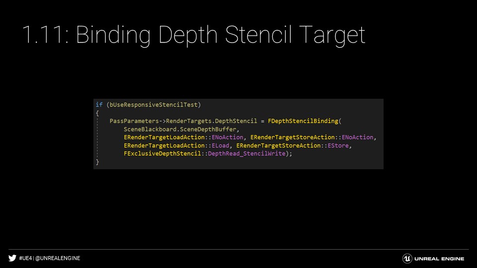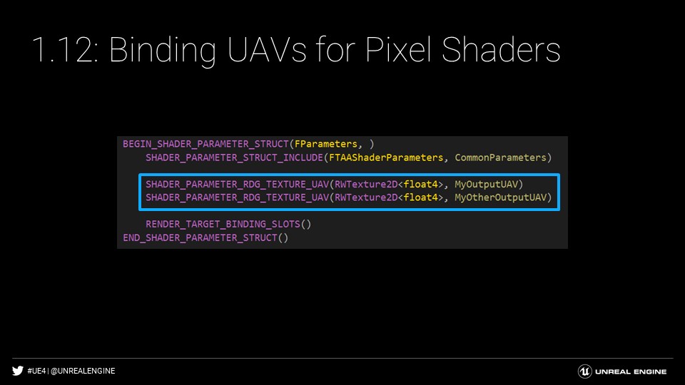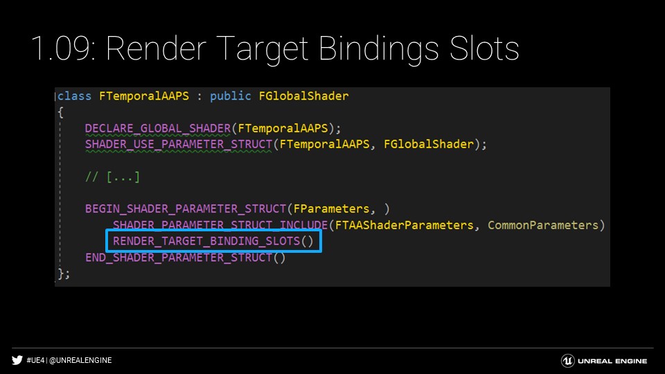 래스터 파이프라인을 사용하는 패스를 제작할 때는 패스 파라미터 구조체에 RENDER_TARGET_BINDING_SLOTS() 매크로를 추가하세요. 이렇게 하면 패스에 의해 선택될 렌더 타깃 및 뎁스 스텐실에 대한 입력이 노출됩니다. 이 데이터는 셰이더에서 무시됩니다.