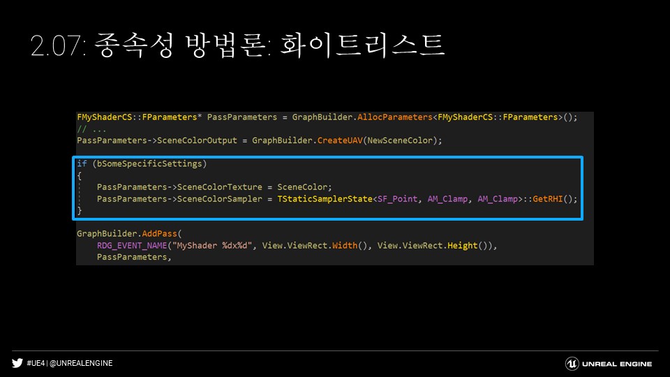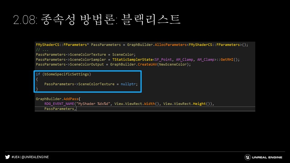 AddPass는 그래프 실행 함수에 의해 실제로 사용되지 않더라도 전달 매개변수 구조체에서 발견된 모든 RDG 리소스를 처리합니다! 여기에는 메모리 할당 및 배리어/레이아웃 전환 수행과 같이 비용이 많이 드는 작업이 포함됩니다. 불필요한 비용을 없애려면 패스에 실제로 사용되는 리소스만 제공하는 것이 중요합니다. 셰이더 파라미터는 기본값이 0으로 초기화되므로 가장 간단한 해결책은 사용 조건에 따라 브랜치 할당을 통해 필요한 리소스를 화이트리스트에 추가하는 것입니다(위 예시).