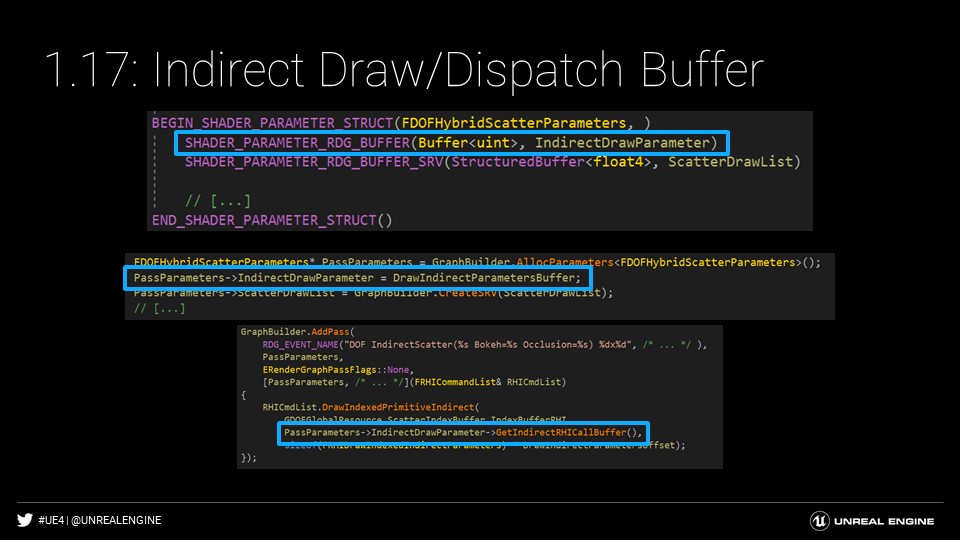 간접 그리기/디스패치 버퍼는 셰이더에서 직접 사용하지 않는다는 점에서 약간 독특합니다. 대신 패스 파라미터에 RDG 버퍼로 선언한 다음 패스에서 직접 RHI 간접 그리기 버퍼를 사용하면 됩니다.