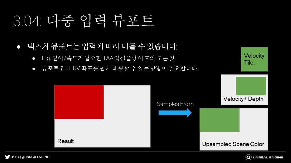 고급 시나리오에서는 텍스처 뷰포트가 입력마다 다를 수도 있습니다. 예를 들어 모션 블러에서 뎁스와 속도는 하나의 뷰포트를 공유하지만, 씬 컬러는 TAA에서 업샘플링 되었으므로 두 번째 뷰포트가 있고, 마지막으로 속도 타일 분류 텍스처는 세 번째 뷰포트가 있습니다. 요컨대, 이러한 뷰포트 공간 간에 UV 좌표를 쉽게 매핑할 수 있는 방법이 필요합니다.