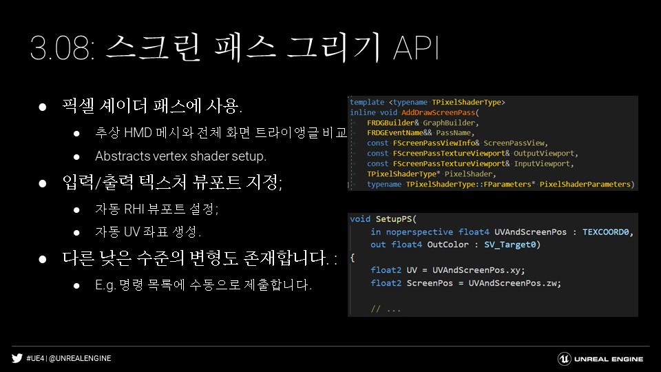 픽셀 셰이더 작업을 더 쉽게 하기 위해 프레임워크에는 픽셀 셰이더 패스를 렌더 그래프에 직접 추가할 수 있는 유틸리티 함수가 포함되어 있습니다. HMD 메시를 사용할지, 전체 화면 트라이앵글을 사용할지 등의 세부 사항을 추상화합니다. 입력 및 출력 텍스처 뷰포트를 제공하면 구현에서 RHI 뷰포트 설정과 UV 좌표 생성을 자동으로 처리합니다. 수동으로 패스를 설정하고 명령 목록에 제출해야 하는 경우와 같이 더 많은 제어가 필요한 경우 이 함수의 다른 저수준 변형이 있습니다.