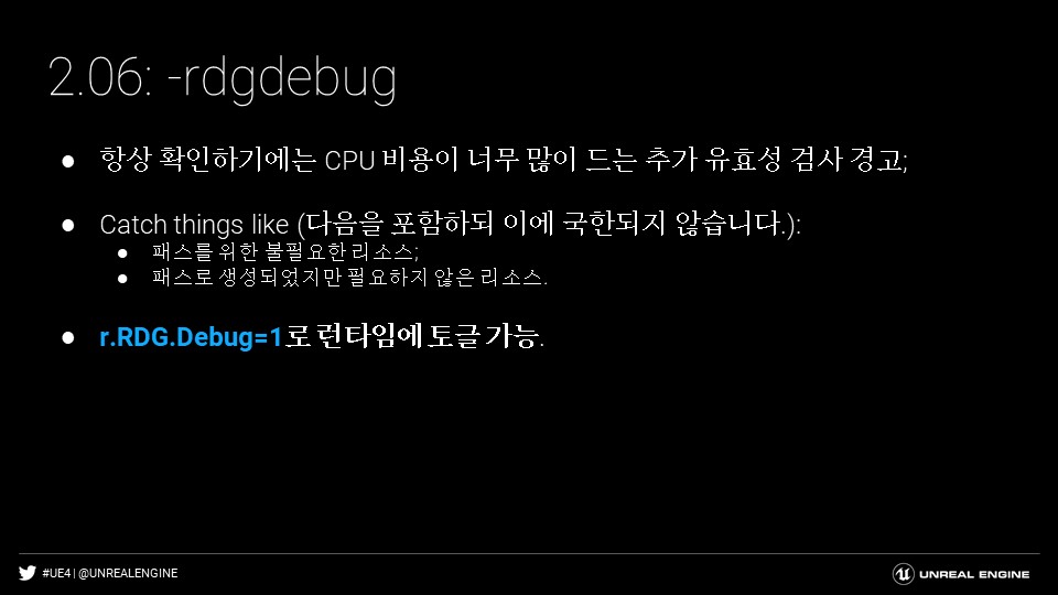 RDG는 그래프 설정과 관련된 문제뿐만 아니라 성능 문제도 잡아낼 수 있는 풍부한 유효성 검사 계층을 제공합니다. 더 많은 비용이 드는 유효성 검사는 명령줄을 통해 또는 런타임 중에 활성화할 수 있는 CVar 뒤에 숨겨져 있습니다. 유효성 검사의 일반적인 사례 중 하나는 선언되었지만 패스에서 실제로 사용되지 않는 리소스를 포착하는 것입니다.