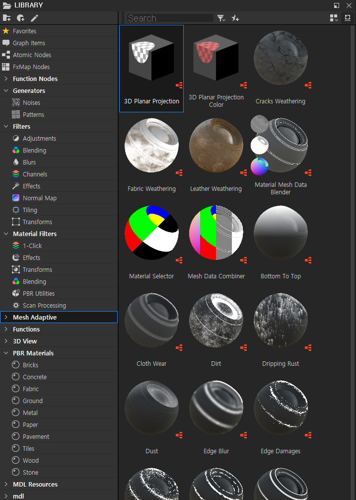 하지만 라이브러리 안에는 세부적으로 필터 이외에도 개별적 function , mesh , sbs , sbsr 등이 모두 포함 되어 집니다.