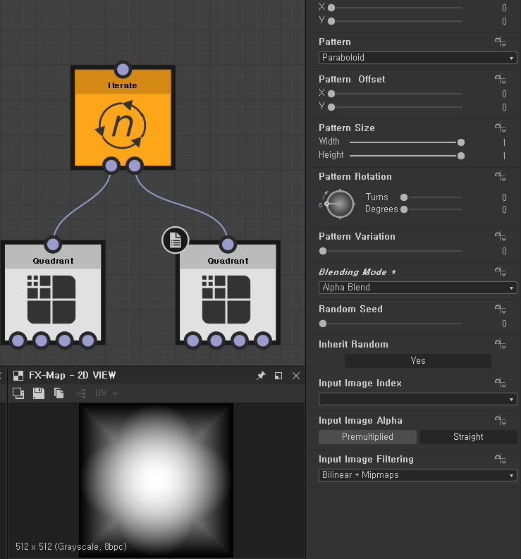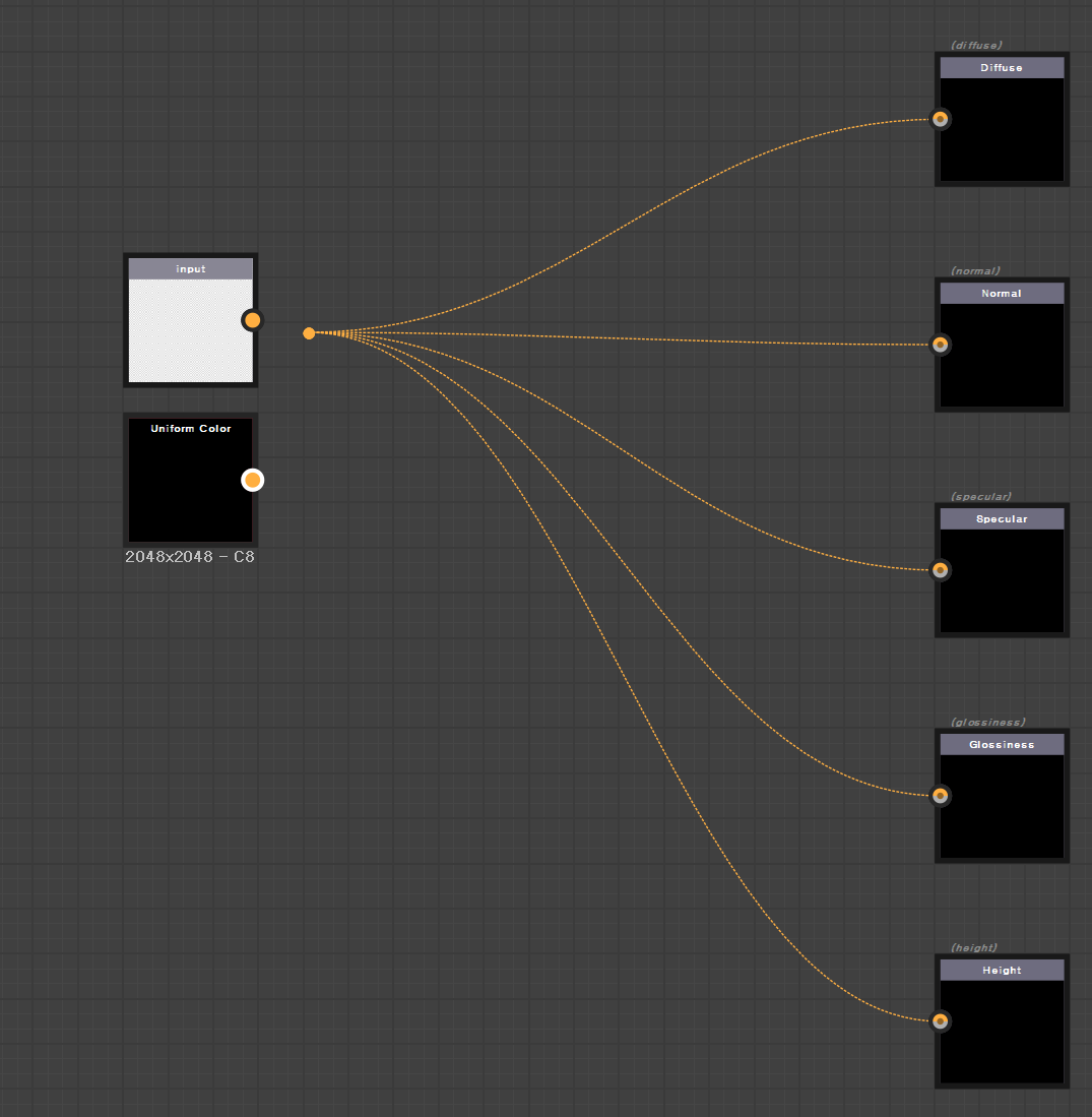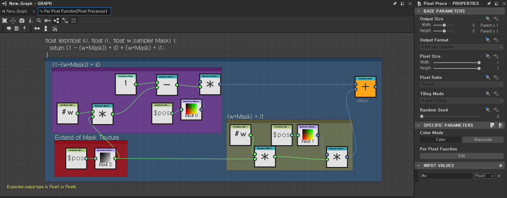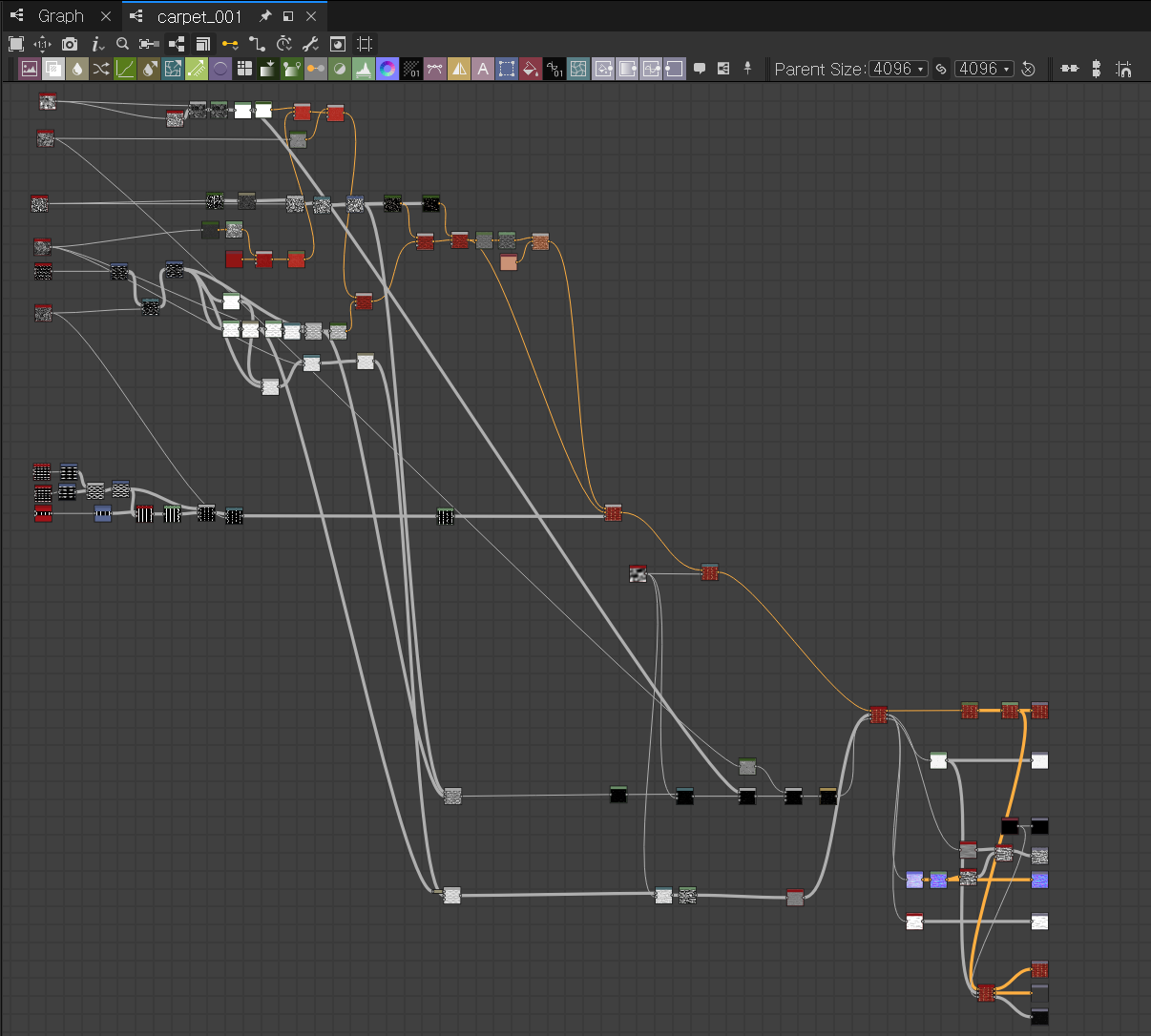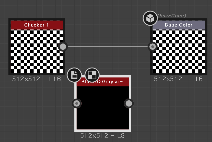 독립적으로 구현 되어 있는 각각의 필터들을 연결 하여 절차적 텍스처를 구성 하게 되는 핵심 작업 공간 입니다.