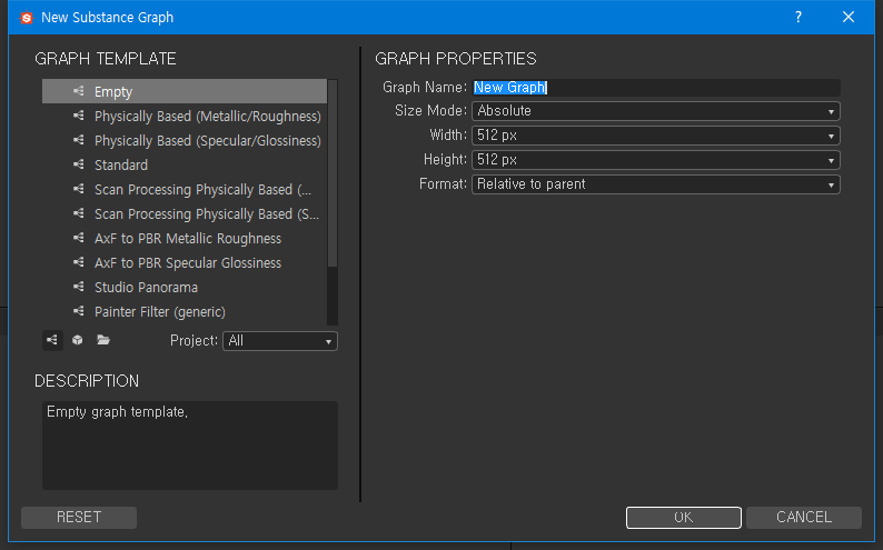 Physically Based(Metallic/Roughness) 를 선택 하고 OK 하면 해당 템플릿에 일반적으로 필요 한 Graph Outputs 가 설정 된 상태로 첫 그래프가 만들어 지게 됩니다.