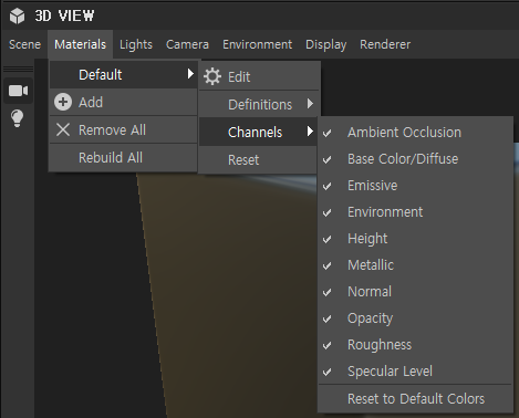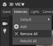 섭스턴스의 편집 워크플로우를 나중에 다루겠지만 맥스나 마야등에서 작성 되어 온 멀티메트리얼 정보등을 하나로 초기화 시킬 때 Materials / Remove All 을 하면 여러개의 메트리얼 정보를 오직 하나의 디펄트 메트리얼 정보로 통합 합니다.