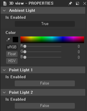 환경광 색상 설정 그릭고 두 개의 Point Light 를 켜거나 끄고 색상을 수정 할 수 있다.