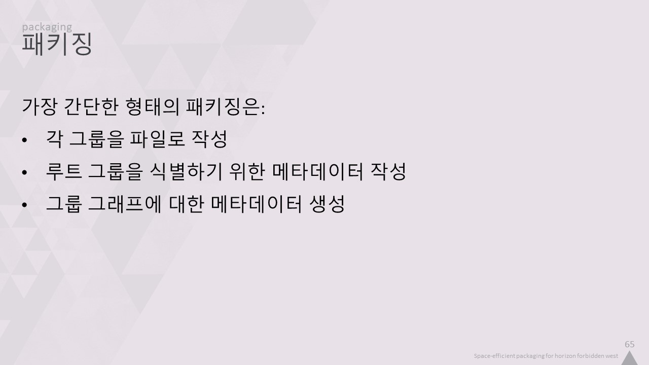 언리얼엔진으로 프로젝트를 진행 하면서 머트리얼이나 셰이더에 대한 파인튠 업무를 제외하면 크게 매력적인 업무들이 별로 없기도 하고 해서... 최근엔 계속 CI/CD 나 콘텐츠 패키징 및 자동화 시스템 개발에 더 관심을 갖고 있습니다. 와중에 언제나 놀라움을 주는 개발사인 게릴라게임즈의 호라이즌 포비든 웨스트의 공간효율적 패키징 발표자료를 보고서 숙지하는 기분으로다가 변환?을 해 봤네요. 역시 뚜벅이 개발자님들은 지하철로 퇴근 하면서 슬슬 보시도록 준비했다능.... ㅎㅎ