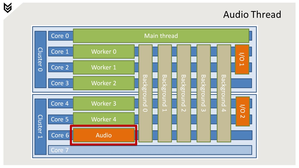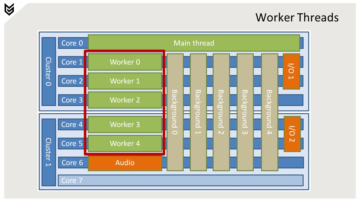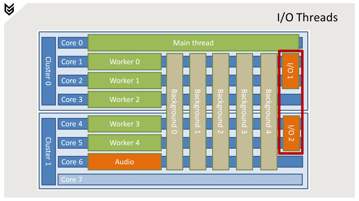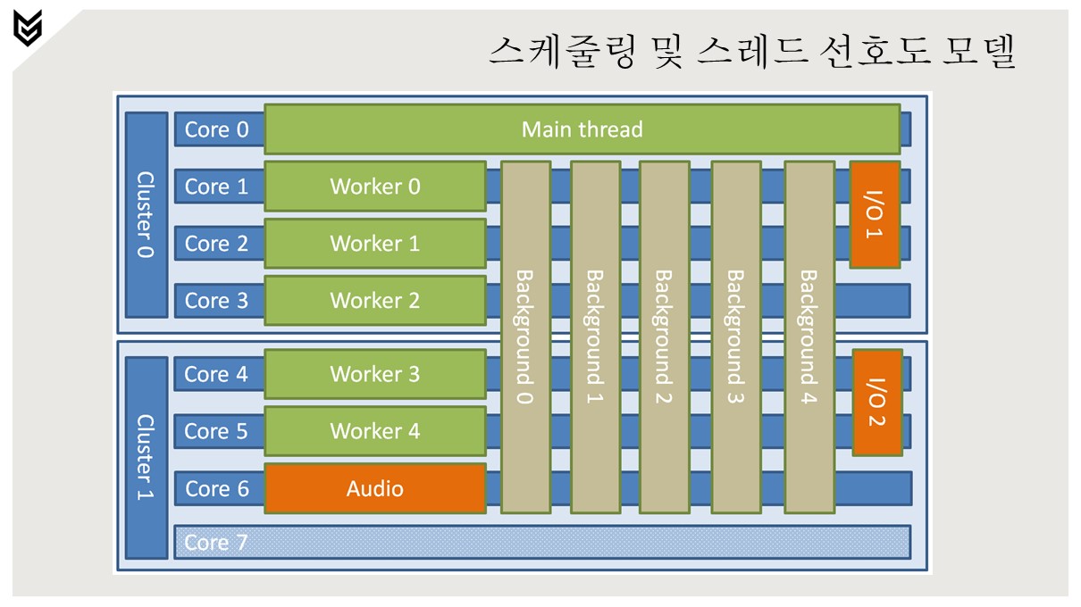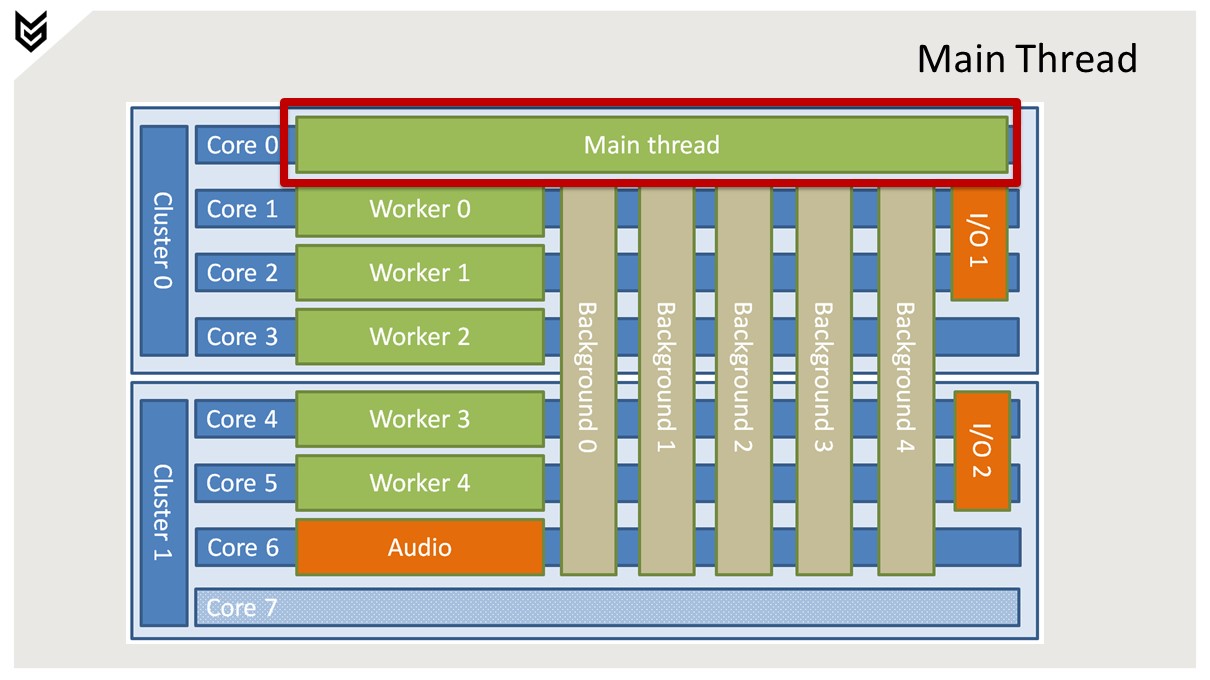 메인 스레드는 코어 0에서 독점적으로 실행.